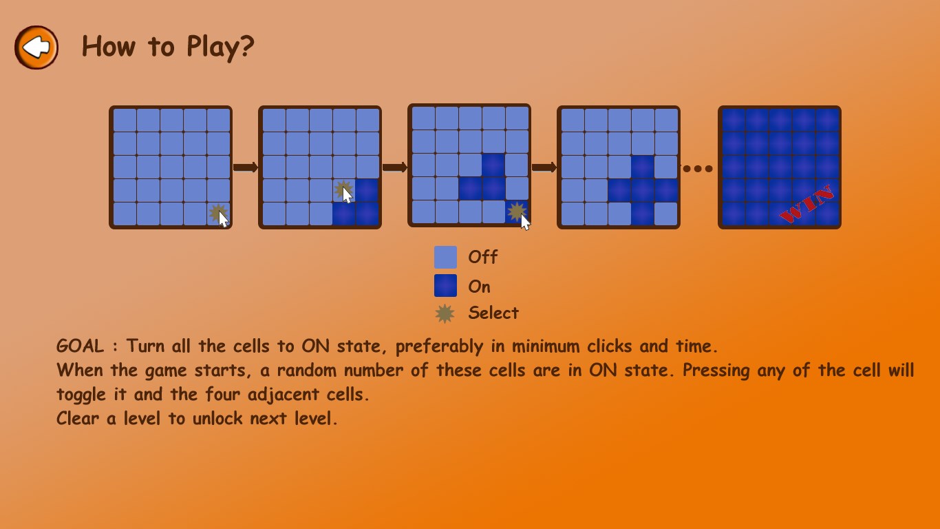 Brain Lightener, comes with rich User Interface, is a puzzle that challenges you to turn all the cells ON in least number of moves and time. This help you to improve your critical thinking and challenges to beat your own high score.
