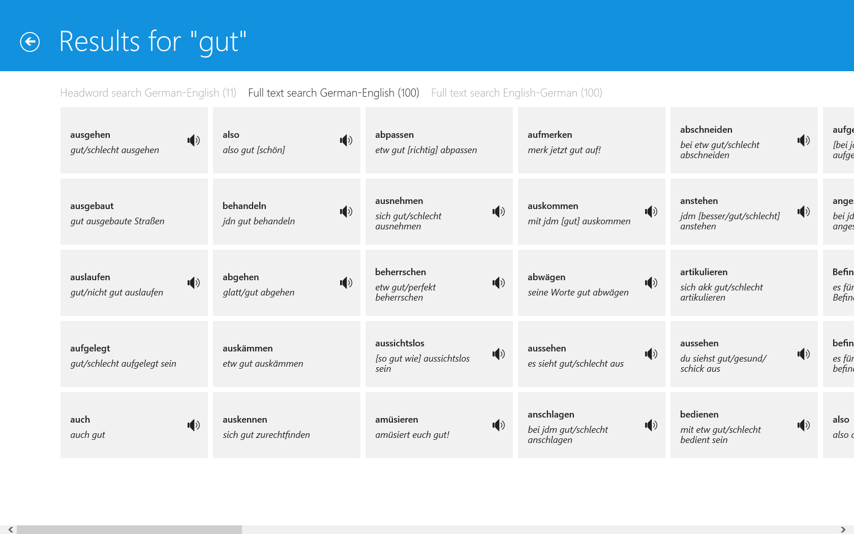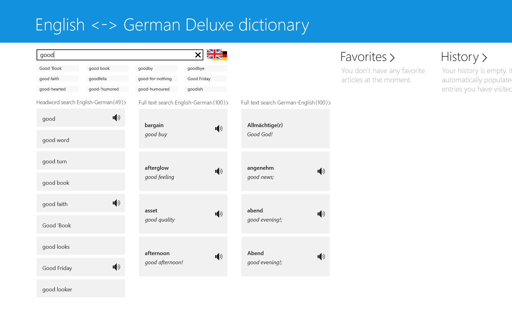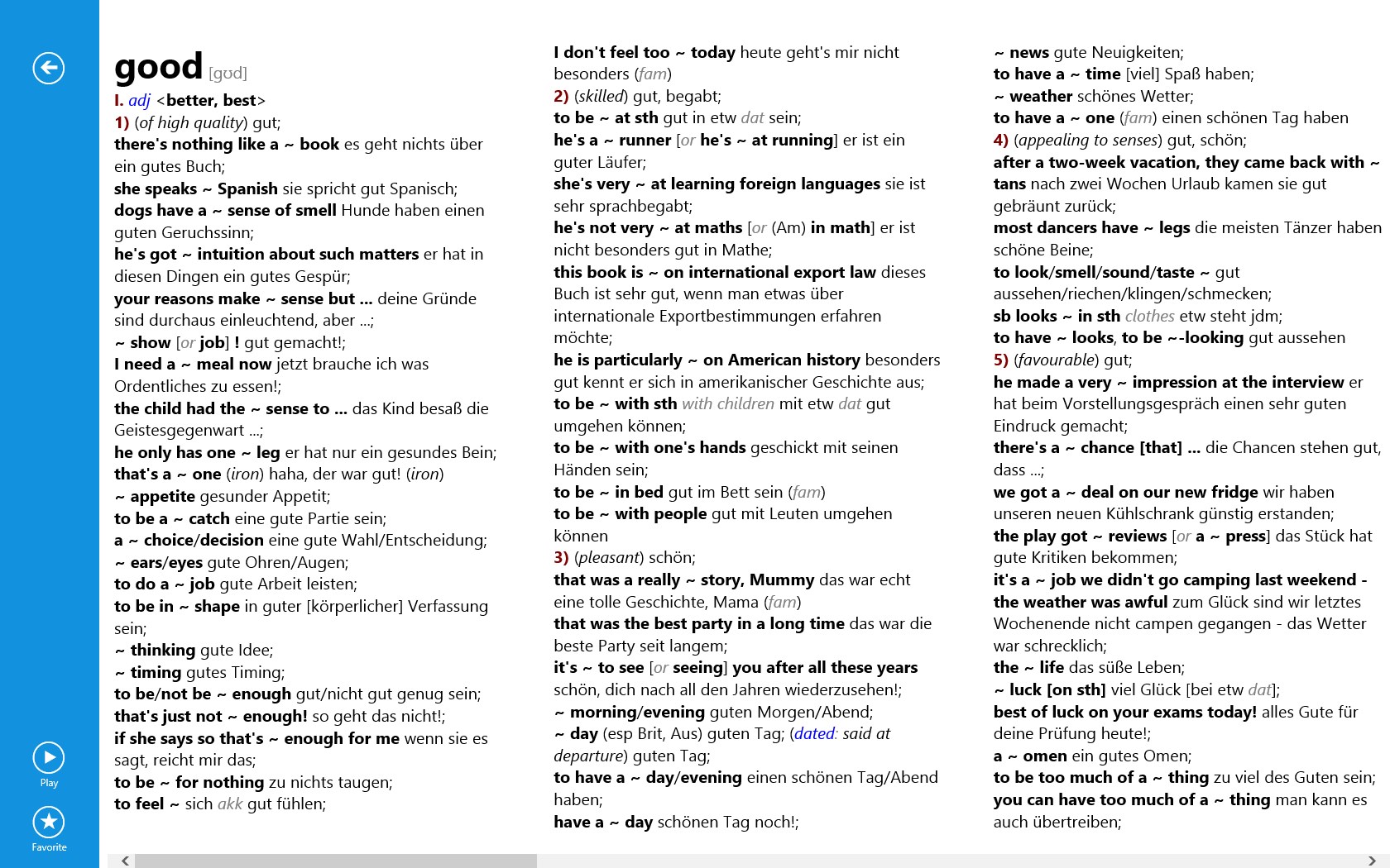 • Full text search allows you to look up words more efficiently throughout the whole dictionary content, including headwords, idioms and usage examples.