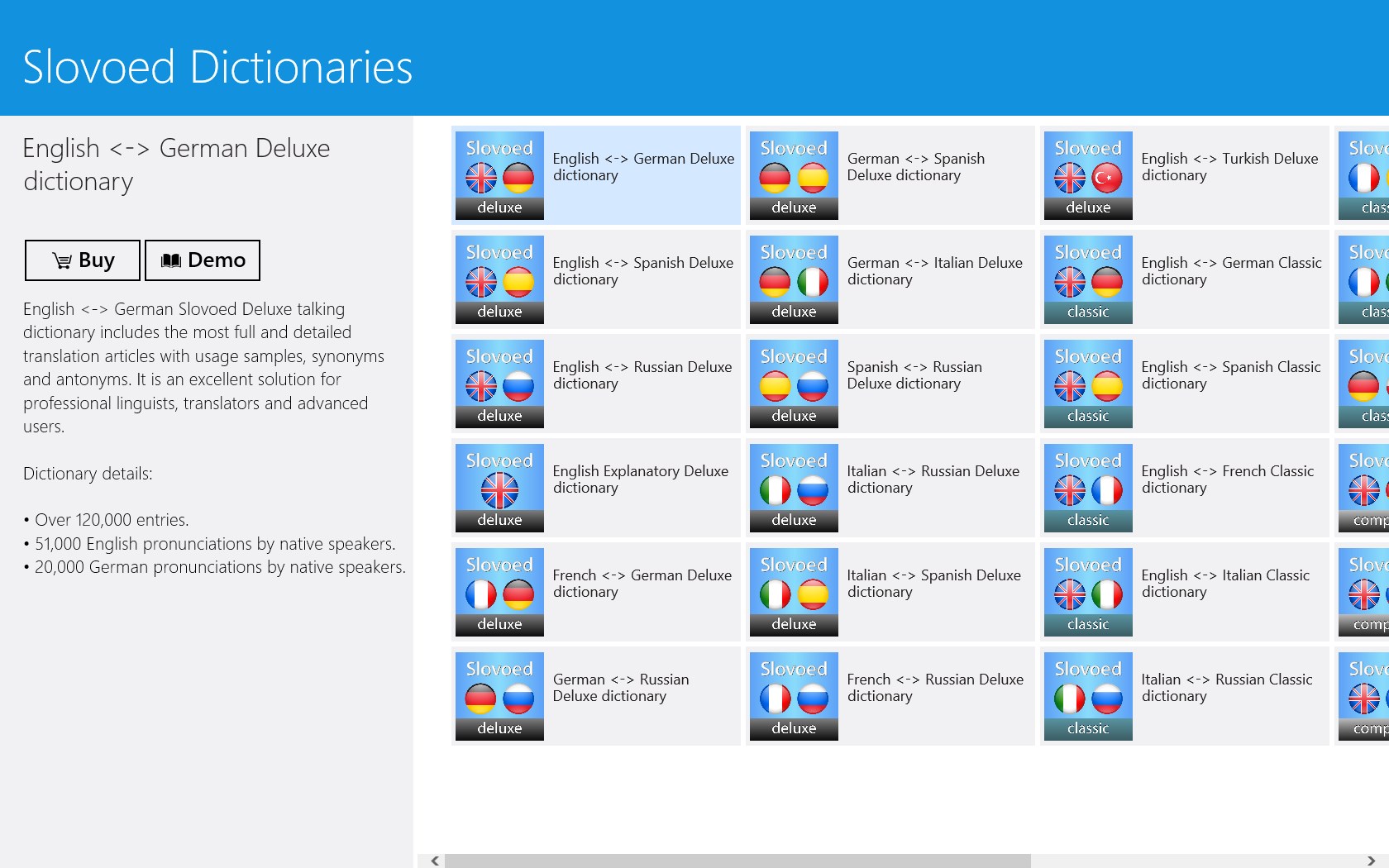 Now you can experience the most advanced search, learning and translation features and make sure that a dictionary complies with your language level and contains all words you need before purchase.