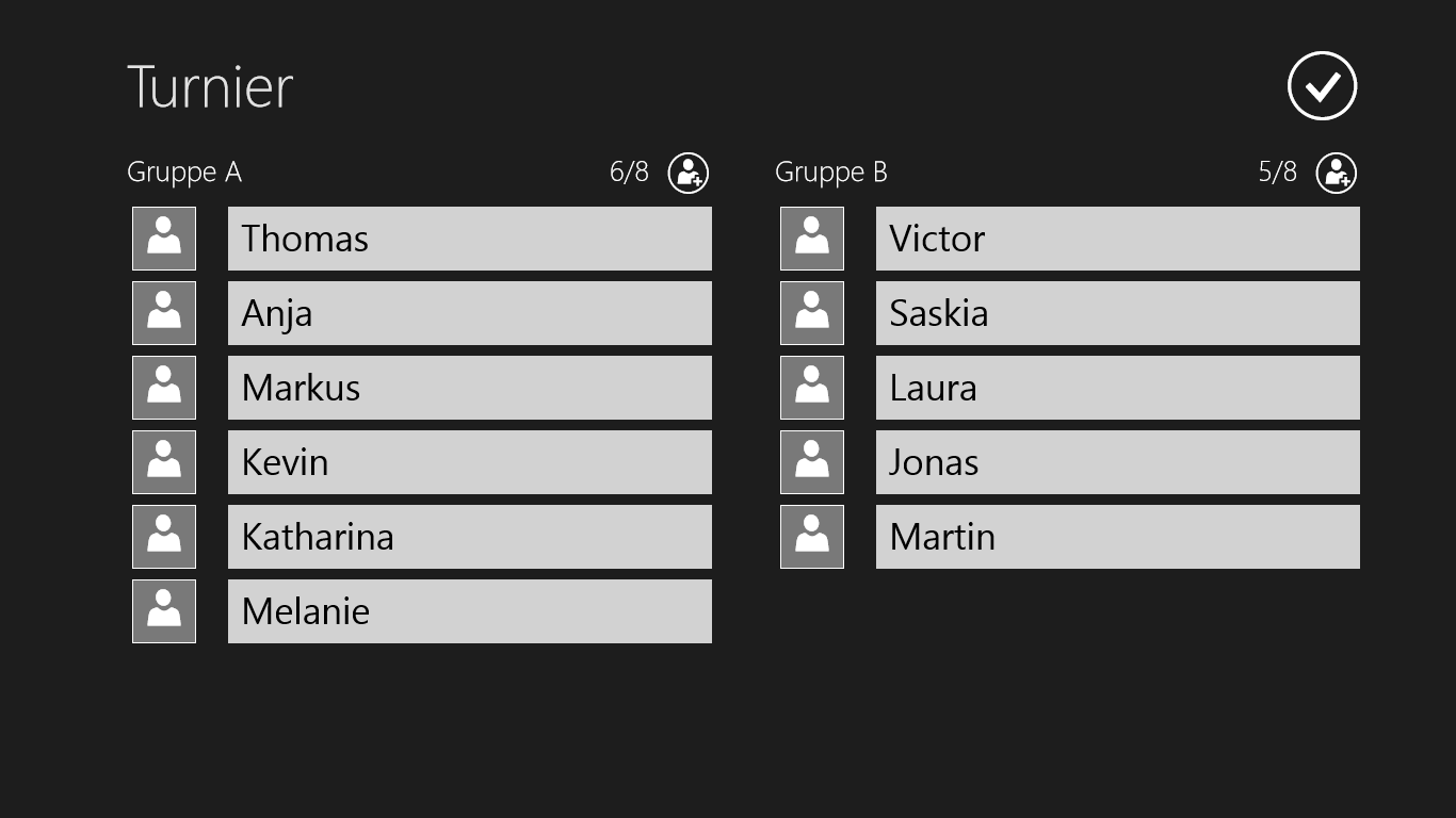 Erst alle Teilnehmer einer der beiden Gruppen hinzufügen und dann einfach starten. In jeder Runde per Tap/Klick den Gewinner auswählen, der in die nächste Runde kommt.