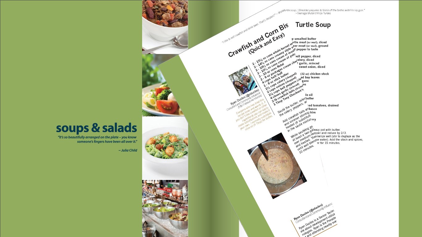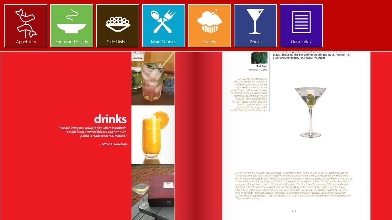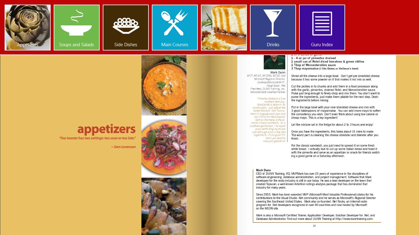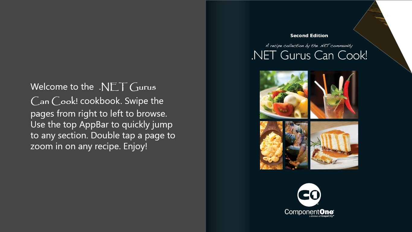 In this second edition of the .NET Gurus Can Cook! cookbook, the developer community has stepped up with even more great recipes. Whether you’re looking to start your meal off with Spinach Mushroom quesadilla appetizers, followed by Chicken and Shrimp Gumbo and Southern Fried Green Tomatoes, then move on to Slow-Roasted Carnitas or Cape Cod Fresh Swordfish for the main course, and finish it off with a Dulce de Leche cheesecake and Blueberry Mojito, this book is definitely for you! This app is a virtual version of the cookbook created by Russ Fustino from ComponentOne.