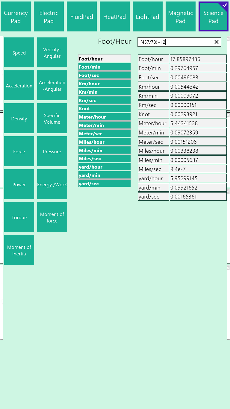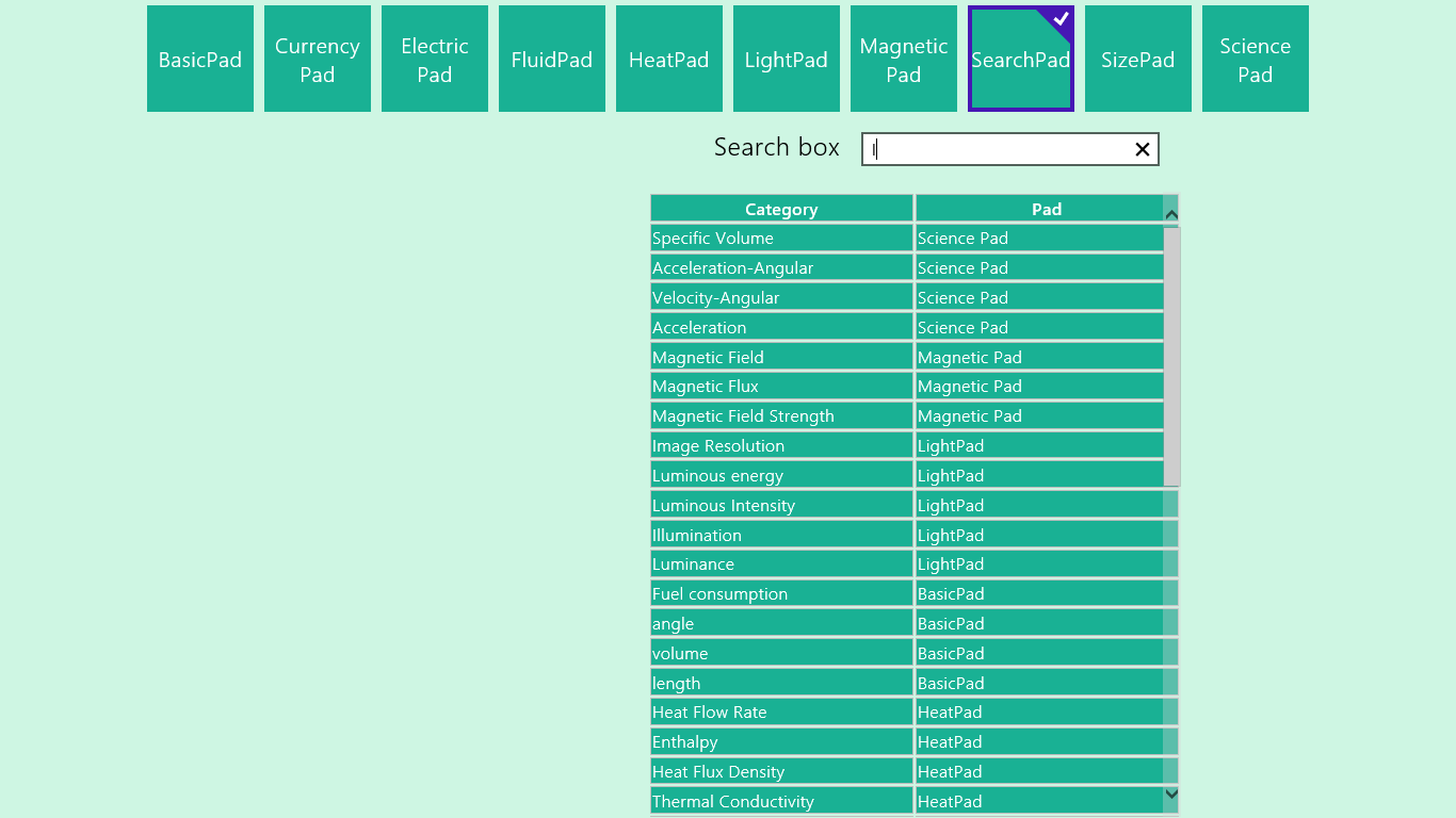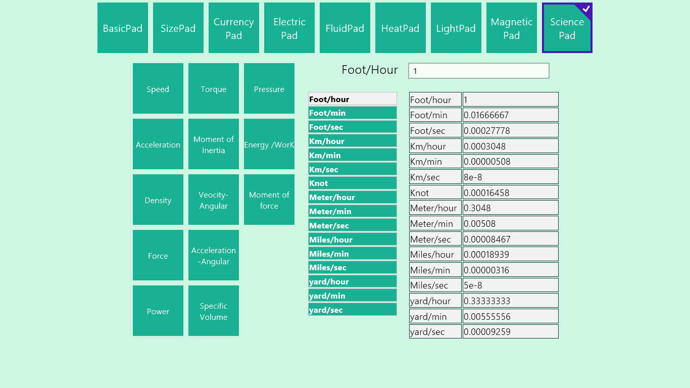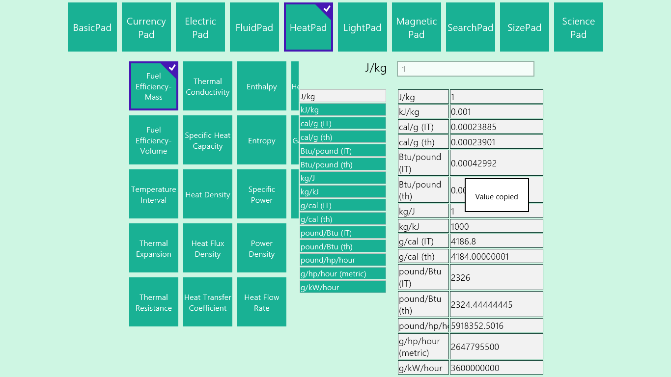 10 pads to perform conversion. BasicPad, SizePad, CurrencyPad, ElectricPad, FuidPad, HeatPad, LightPad, MagneticPad, SciencePad, SearchPadSearchPad for quick search of required unit. Tap takes you to desired categoryTap on value to copy it. :)Inbuilt calculatorSimple, intutive and elegant design