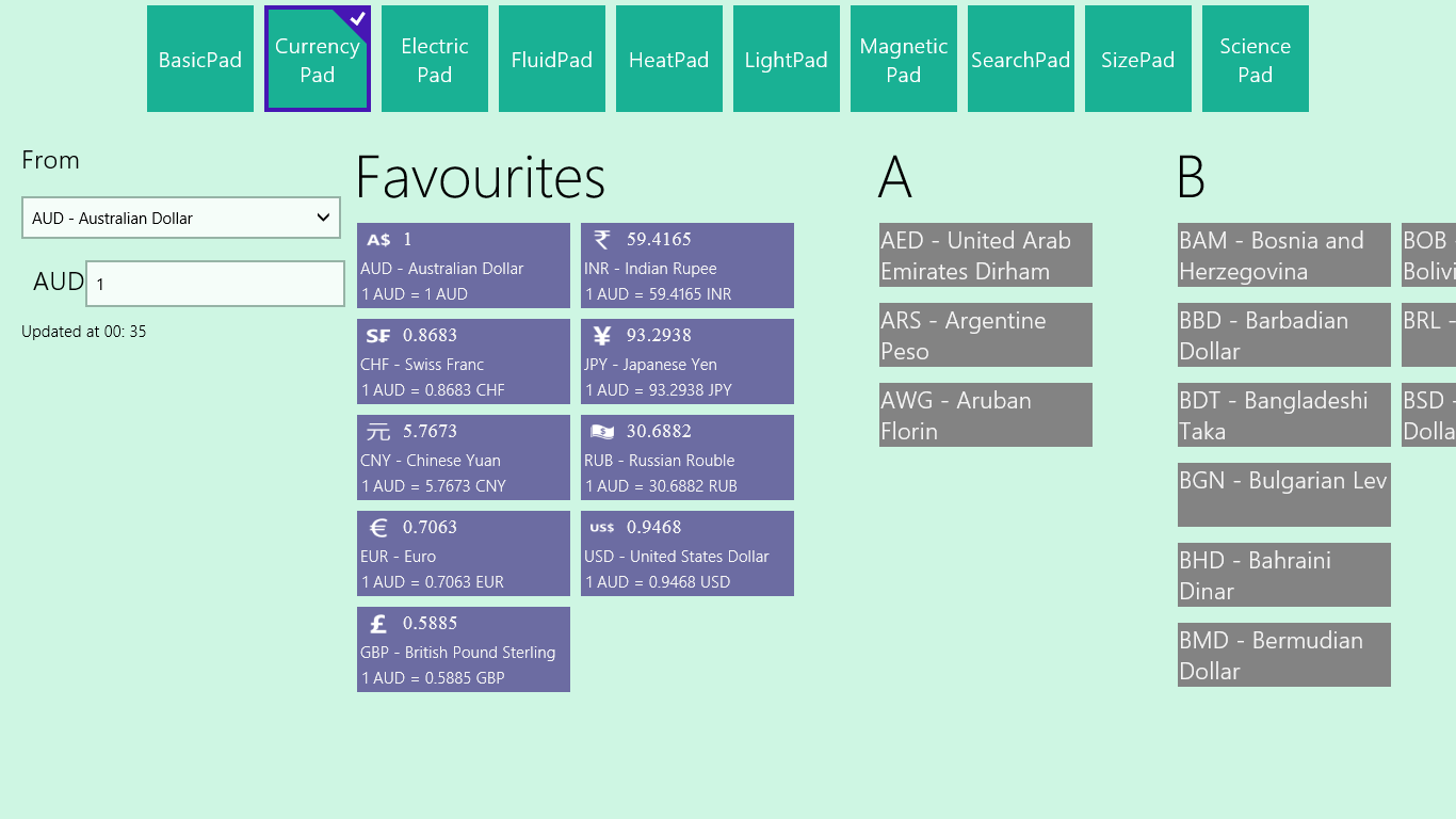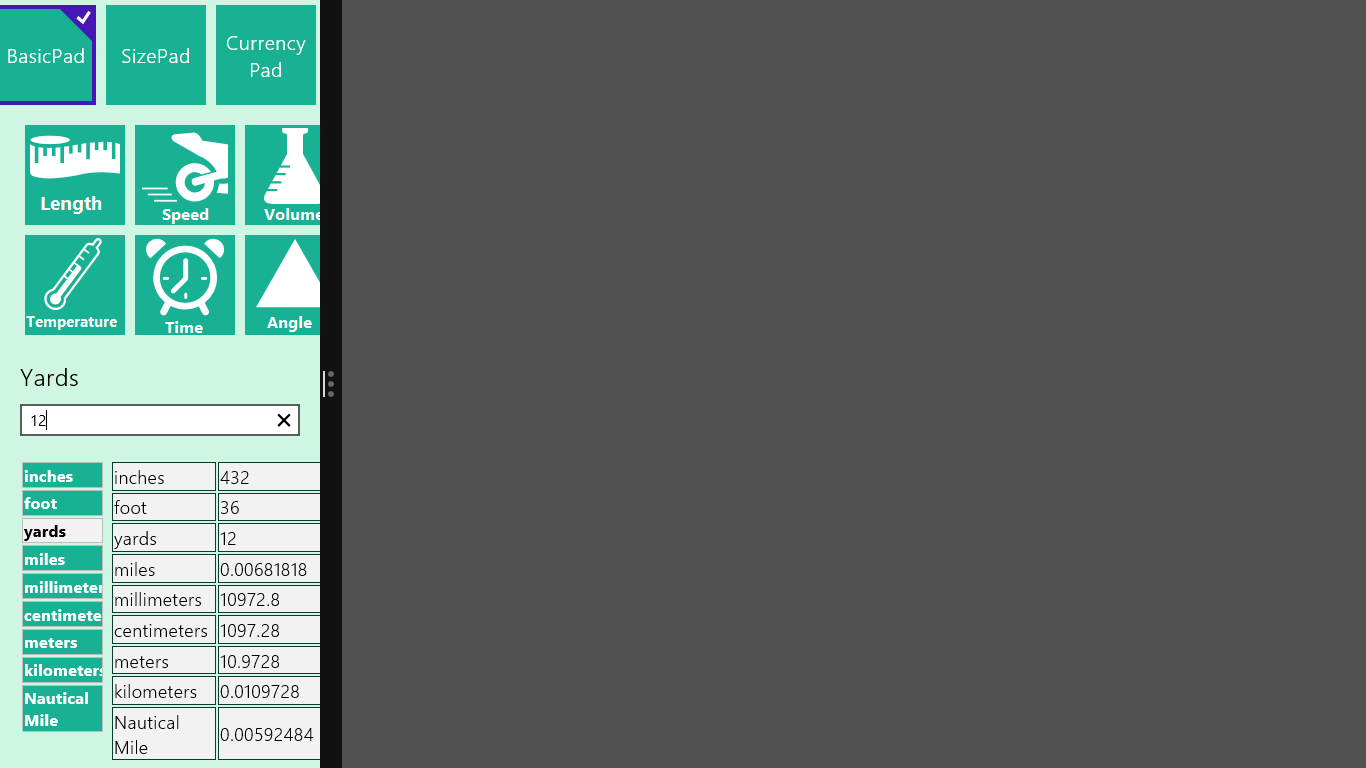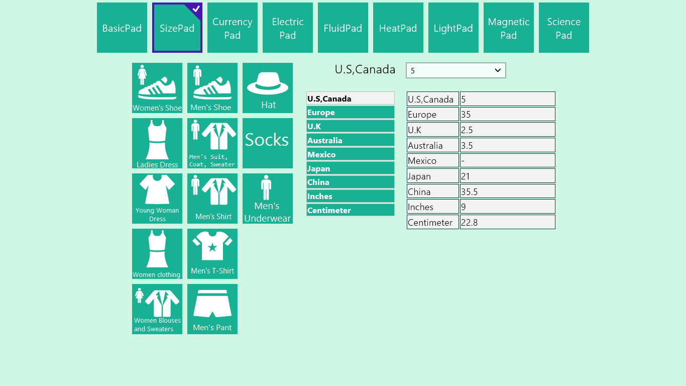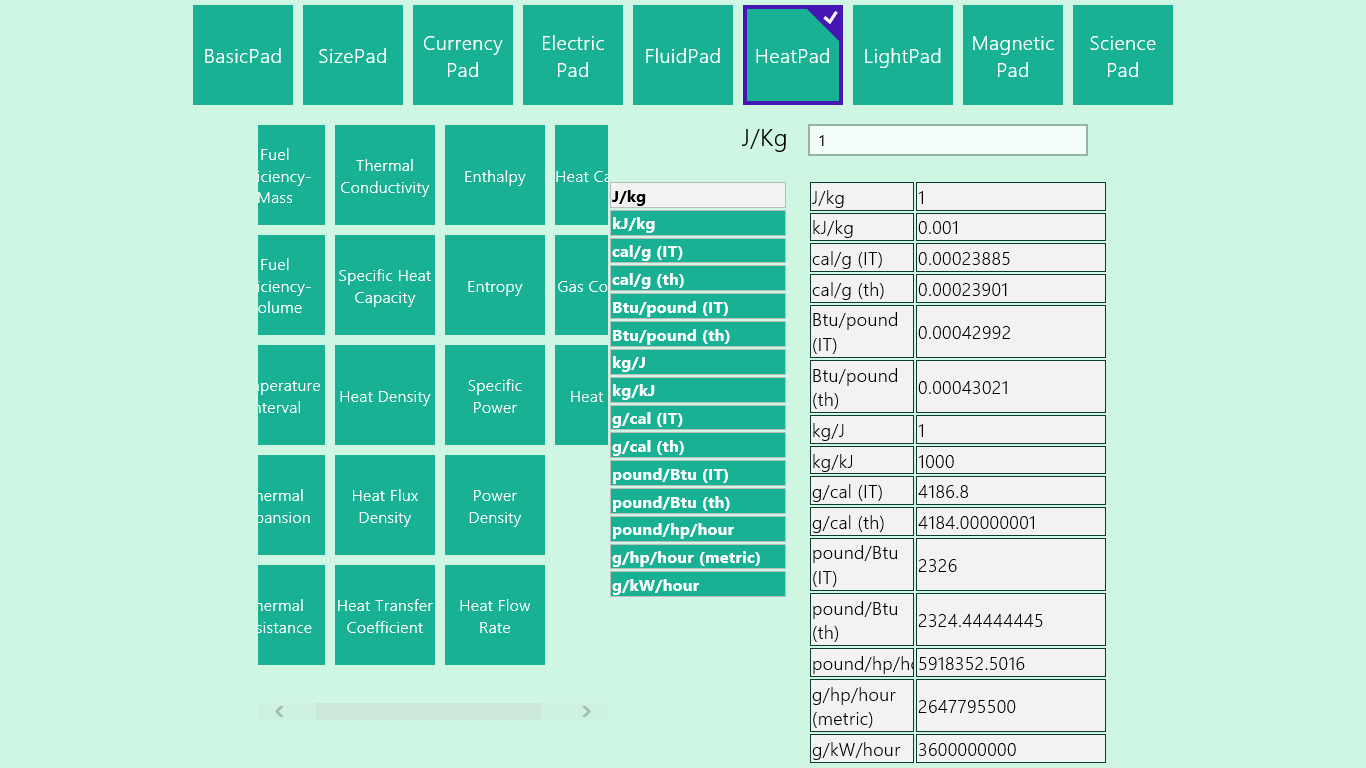 10 pads to perform conversion. BasicPad, SizePad, CurrencyPad, ElectricPad, FuidPad, HeatPad, LightPad, MagneticPad, SciencePad, SearchPadSearchPad for quick search of required unit. Tap takes you to desired categoryTap on value to copy it. :)Inbuilt calculatorSimple, intutive and elegant design