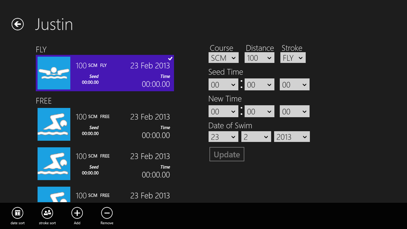 Swim Team Tracker lets you track many swimmers across many dates. Need to see all the swims for a particular swimmer? One Tap. Need to see all the swims for a particular date? One Tap!