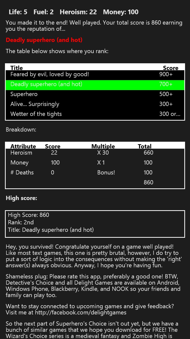 Super simple to learn with one thumb/finger touch control.Life, Heroism, Money, and Fuel are trackedScore and rank at the end.