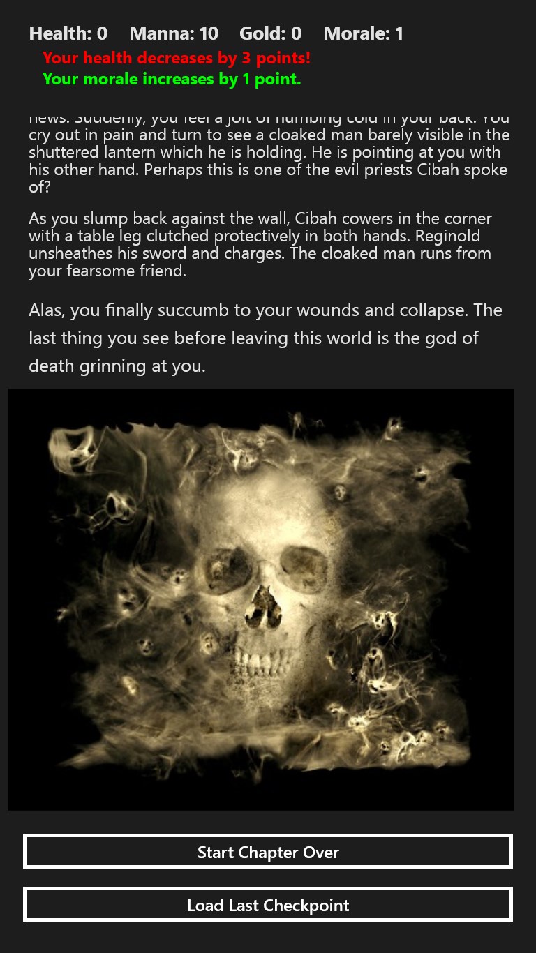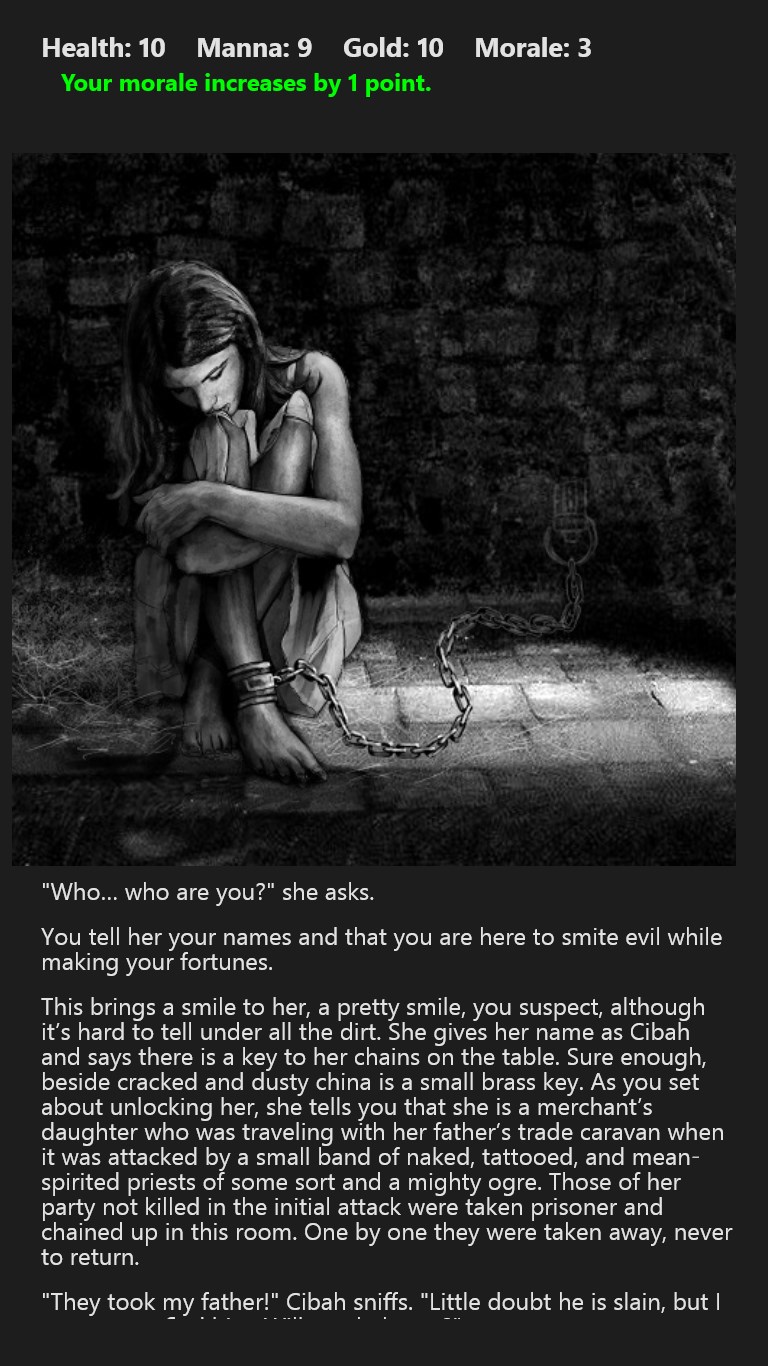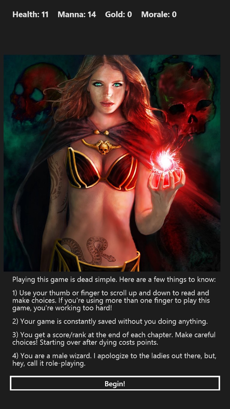 Super simple to learn with one thumb/finger touch control.Health, manna, gold, and morale are tracked.Decisions are effected by earlier decisions.Score and rank at the end.