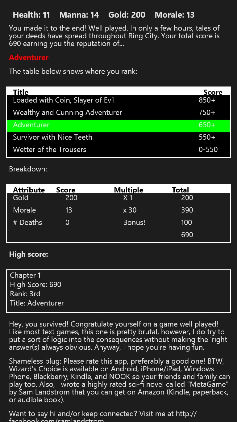 Dungeons & Dragons meets Choose Your Own Adventure-style text adventure! Stay alive, manage your spell power, find treasure, and smite evil. Wizard's Choice is a series of RPG text-based adventures that will engross you in a storyline while allowing you to make the decisions that will determine your fate.