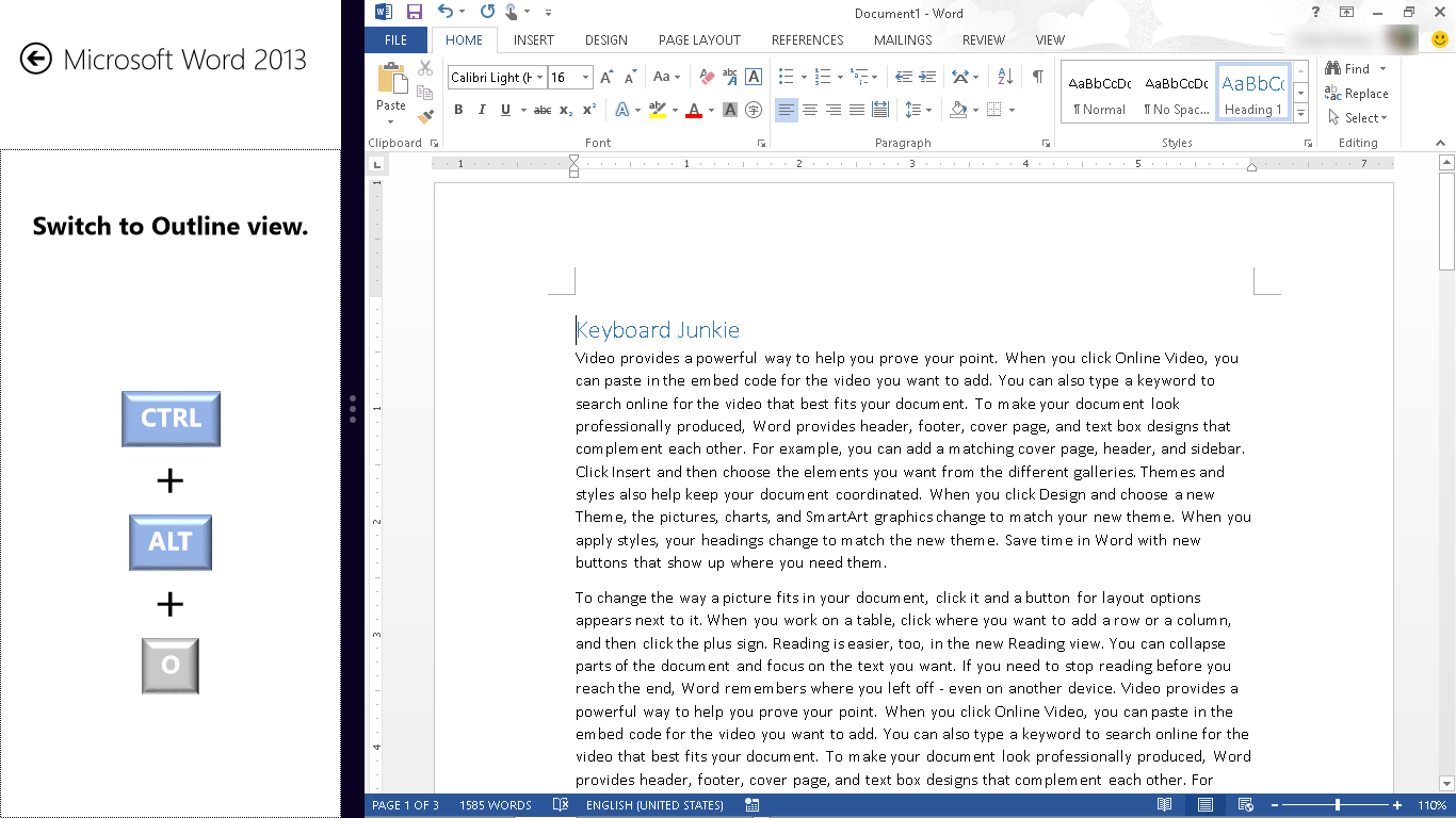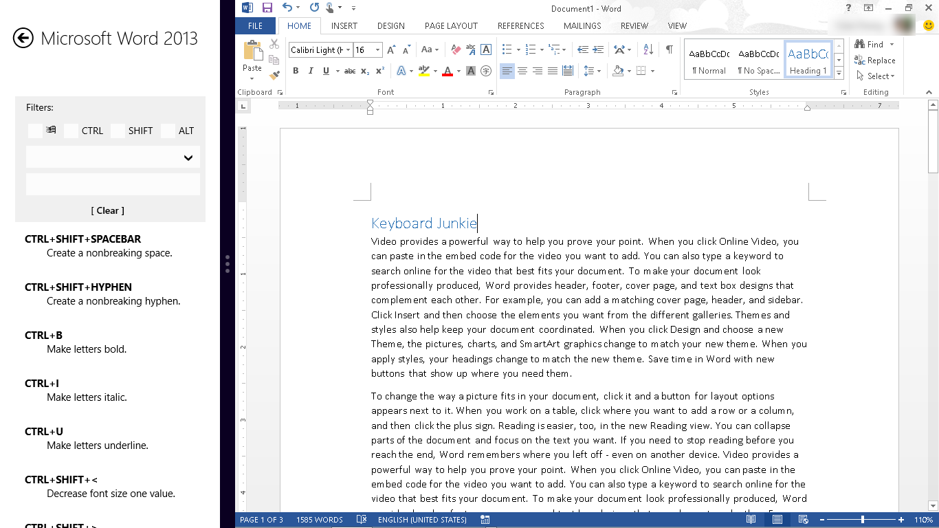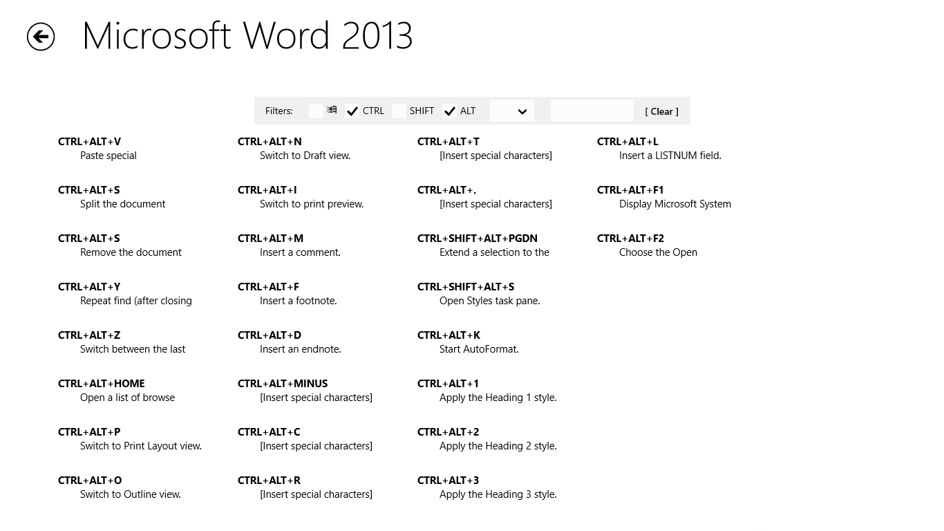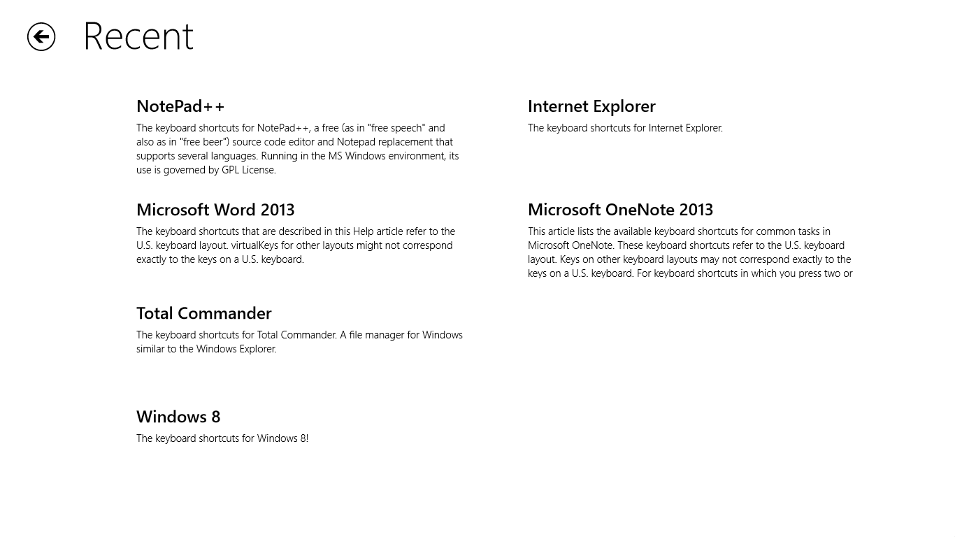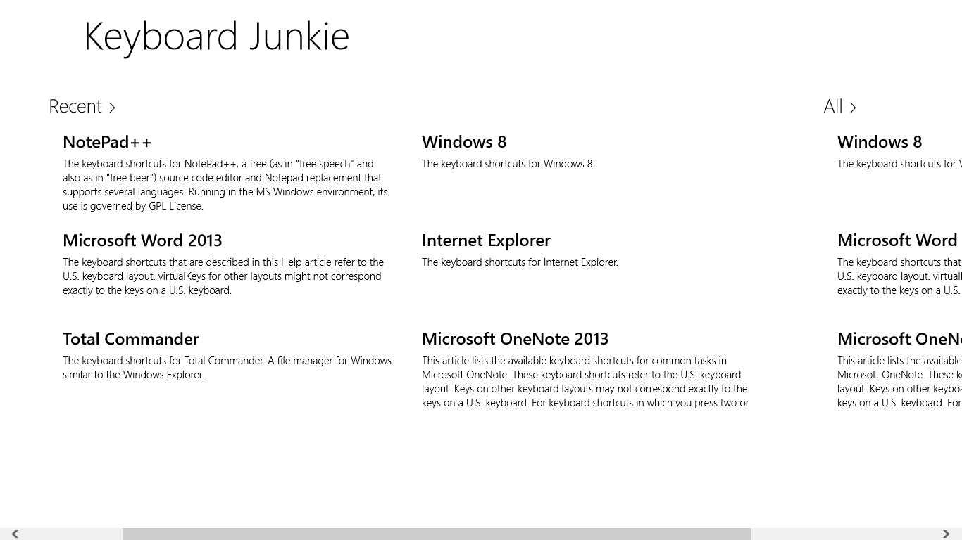 Keyboard Junkie is a tool to help you list, search, memorize shortcut keys of various applications. Currently it includes shortcut keys for Windows 8, Microsoft Word 2013, Microsoft OneNote 2013, Internet Explorer, Total Commander and Notepad++. More collections of shortcut keys will come later.