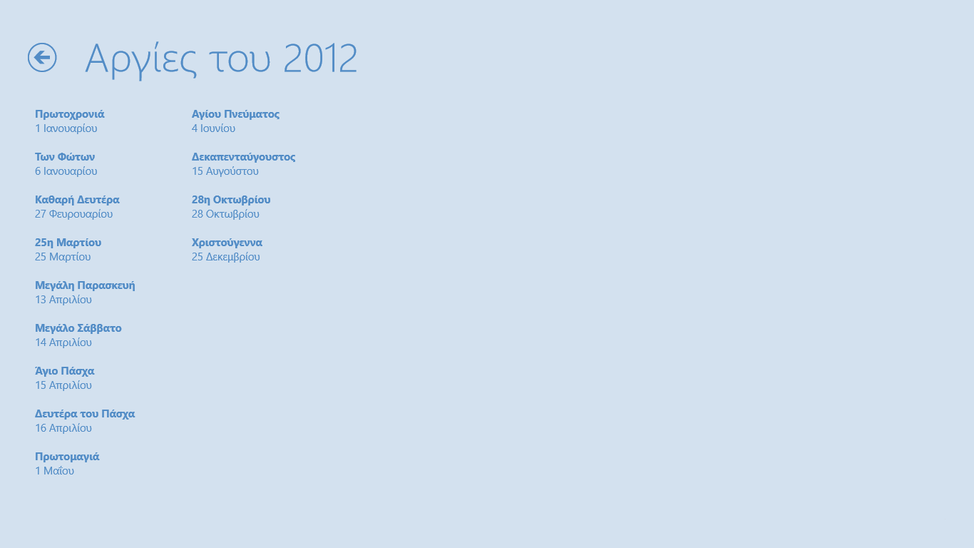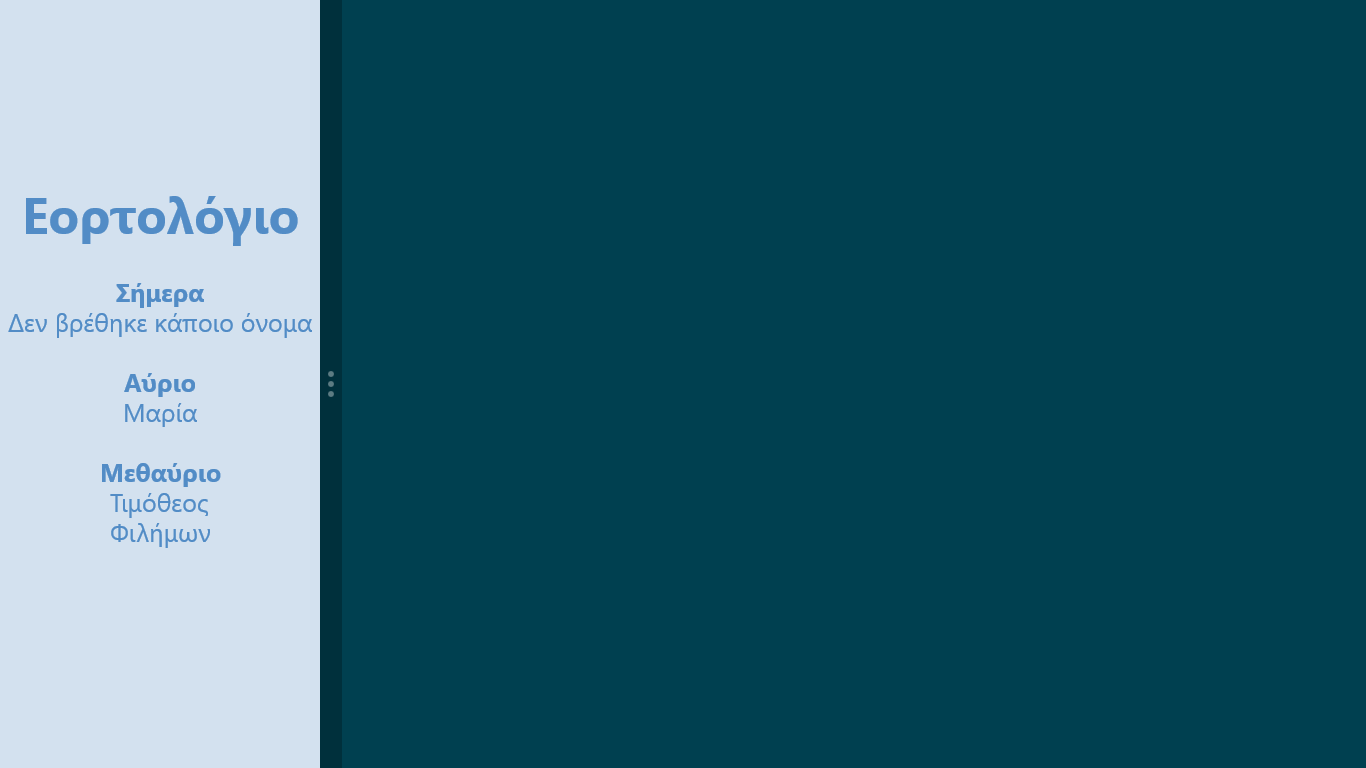 Εμφάνιση εορτών για σήμερα, αύριο και μεθαύριοΑναλυτική λίστα εορτών οργανωμένες χρονολογικάΑναλυτική λίστα εορτών οργανωμένες κατά όνομαΛίστα αργιών για το τρέχων έτος