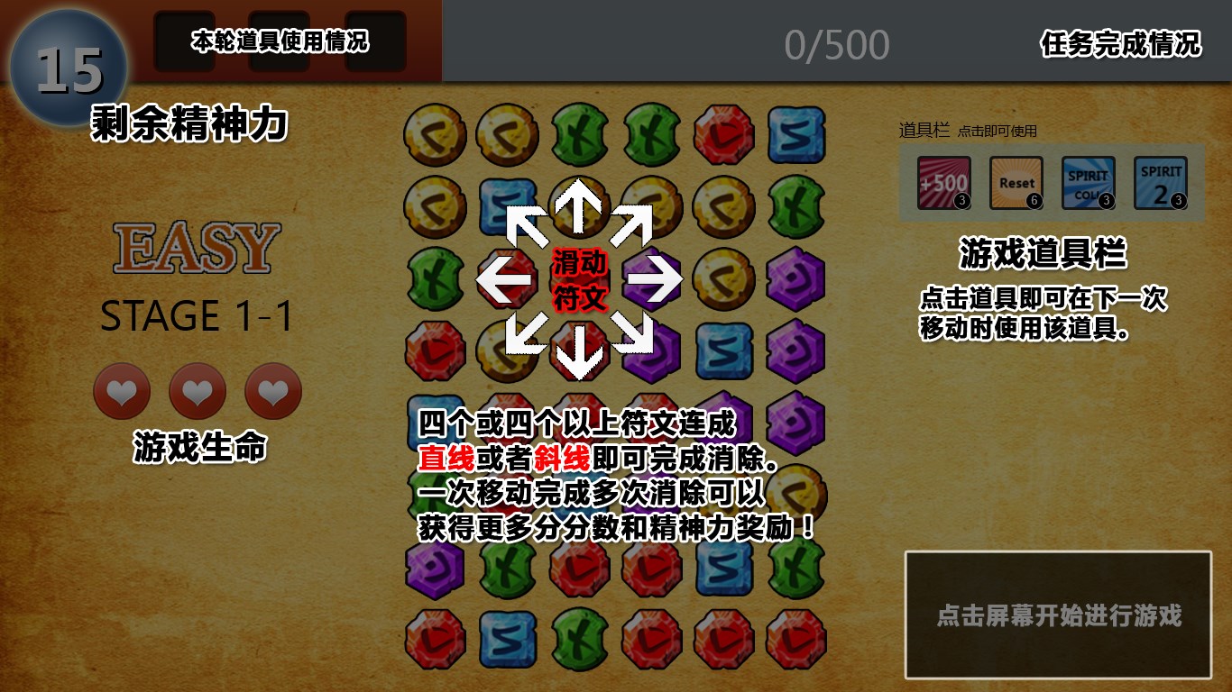 成功消除后,上部的符文会落下填满空格,此时完成的新的消除称为“连击”,分数奖励更多。