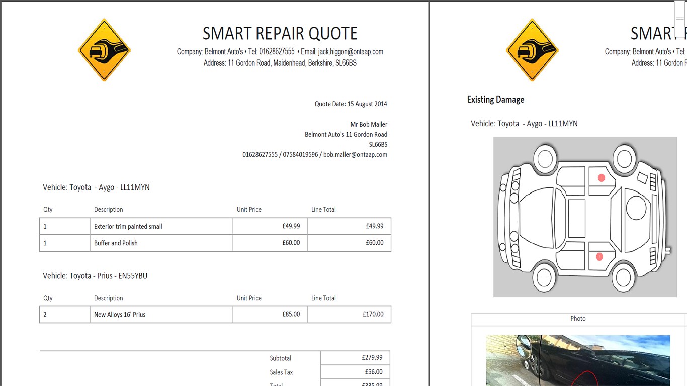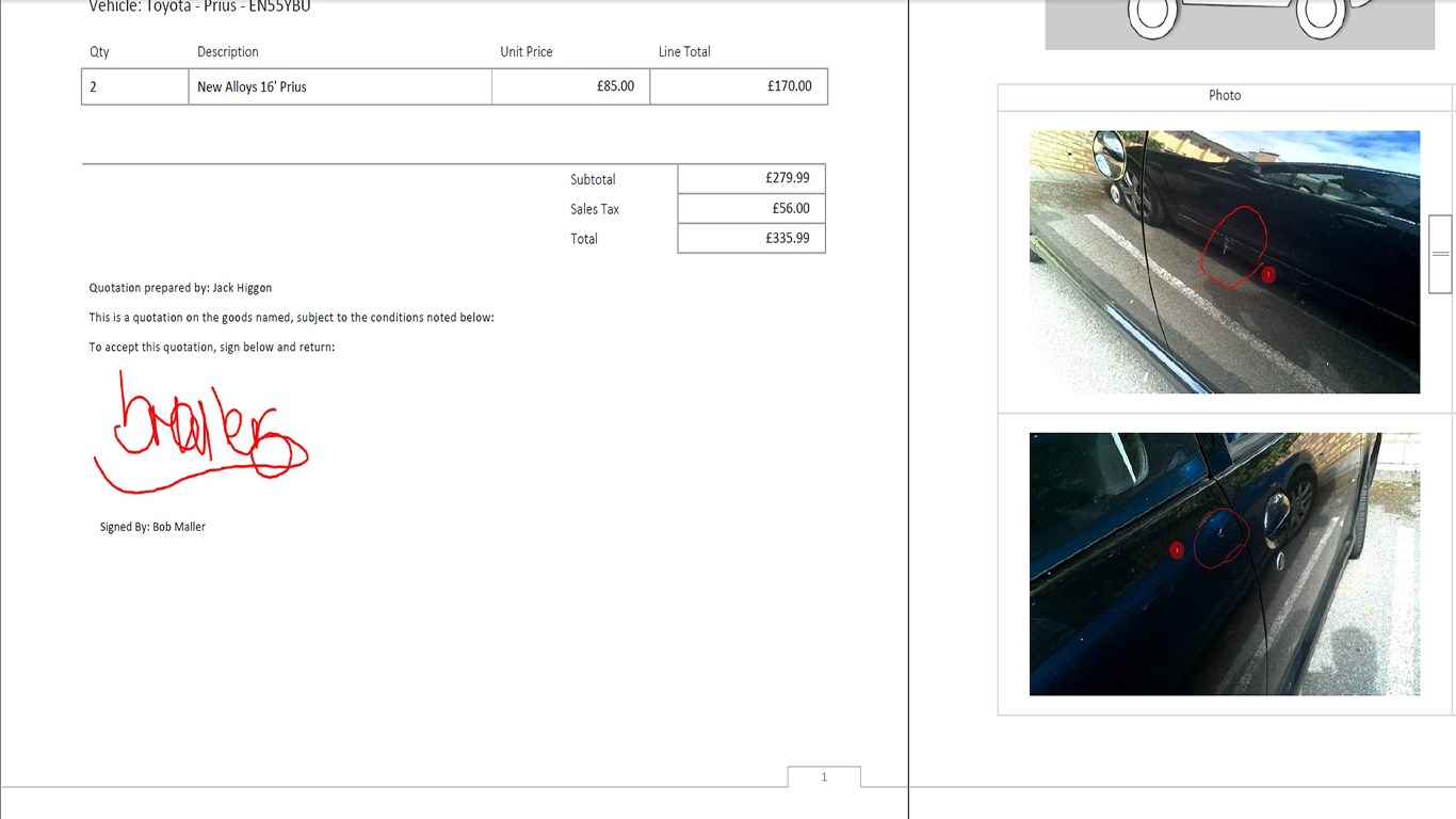 Visit a location and record work required for 1 or more vehiclesCreate a quote or invoice defining the work to be performed with a line item summary by vehicle and work to be performed, including pictures per line itemChoose to generate a summary or detailed view that defines the work, photos per repair item, and the entire damage. Use this to help avoid dispute over what work would be included in any repairsCaptures signaturesTake photos, or attach photos, then amend with line draws and spot markers to annotate and clearly highlight what is being repairedAdd your logo to the Quotes and Invoices generated by the system, with your company name, address and contact detailsRecord the materials required for each vehicle repairPrint a materials sheet as a checklist before starting the work, make sure you are prepared, or sent to a supplier to help order the materials you need to complete the work