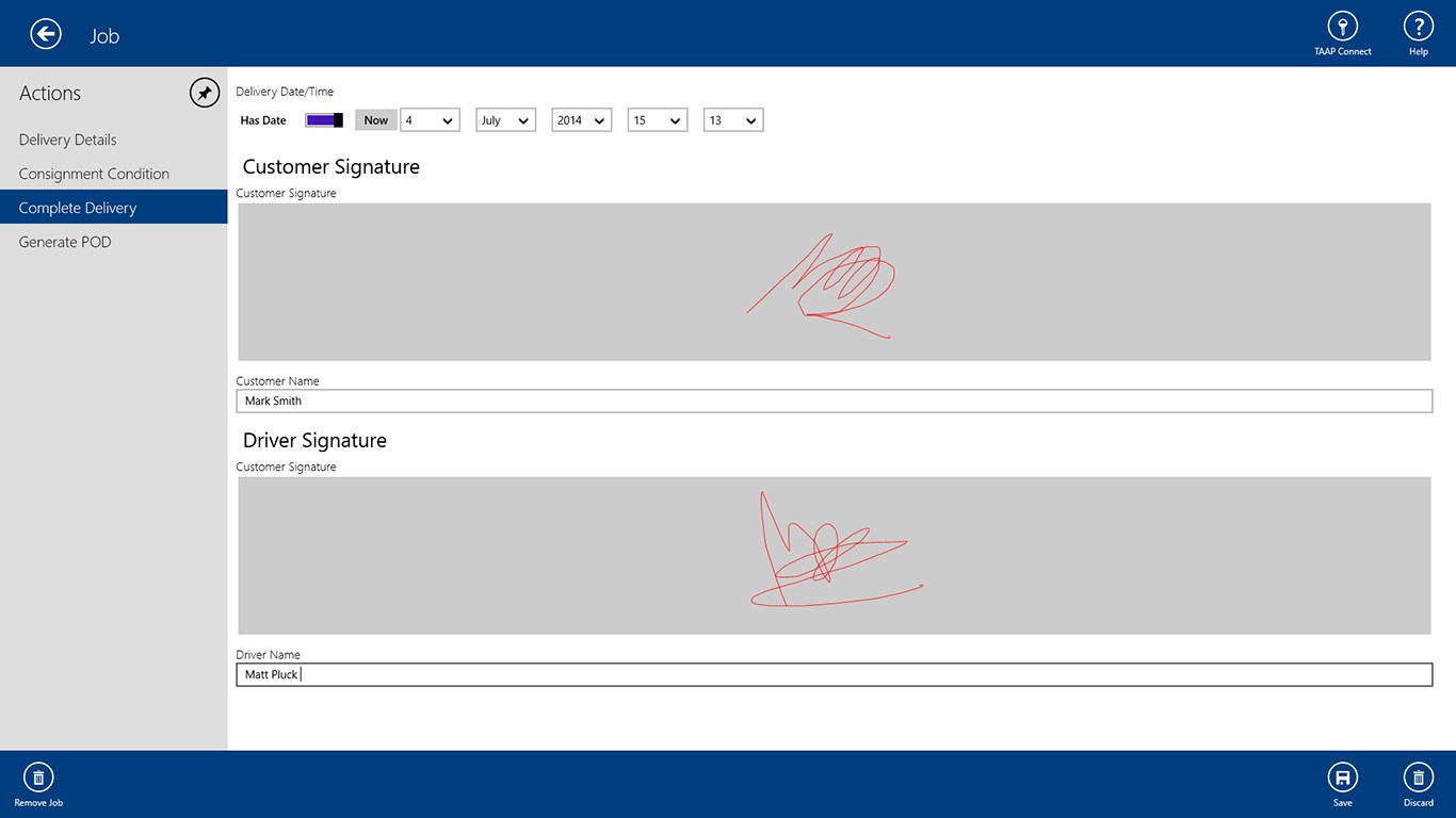 This application can help you manage your Proof of Delivery (POD) process, capturing signatures, damage photos and annotation of any damage recorded, signatures, and then the generation of the paperwork in Microsoft Word for printing or emailing to your customers.