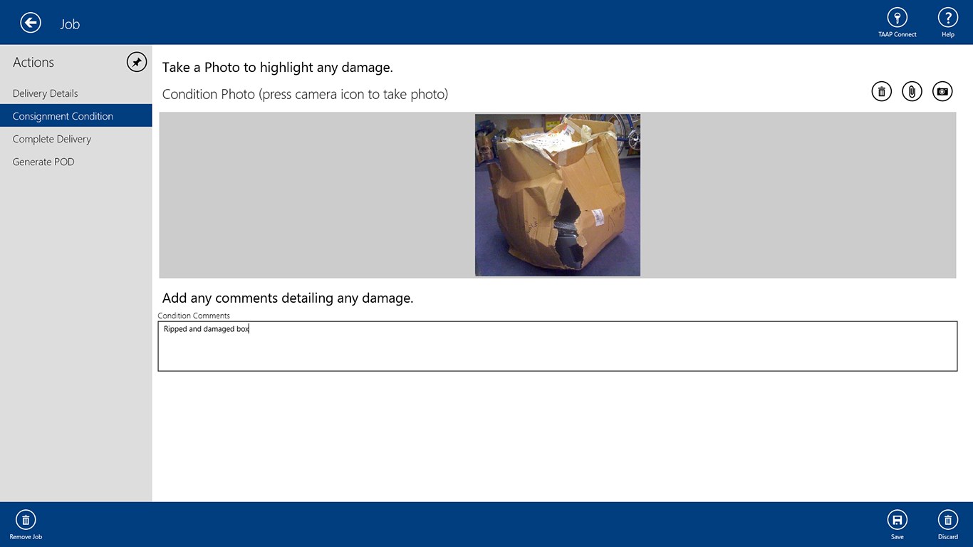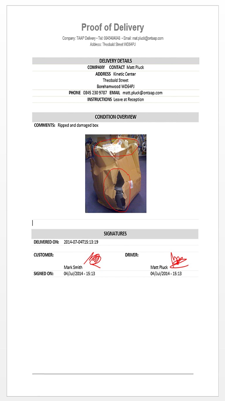 Create a Proof of Delivery Job RecordProvided details of the ConsignmentCapture electronic signaturesTake photos of any damage, event annotate the photo with line drawings and spot markersGenerate the Proof of Delivery paperwork on the devicePrint your Proof of Delivery paperwork to a blue tooth printer or email to your customerUse to help with your insurance claimsAdd your logo to the paperwork to personalise to your brand and identity
