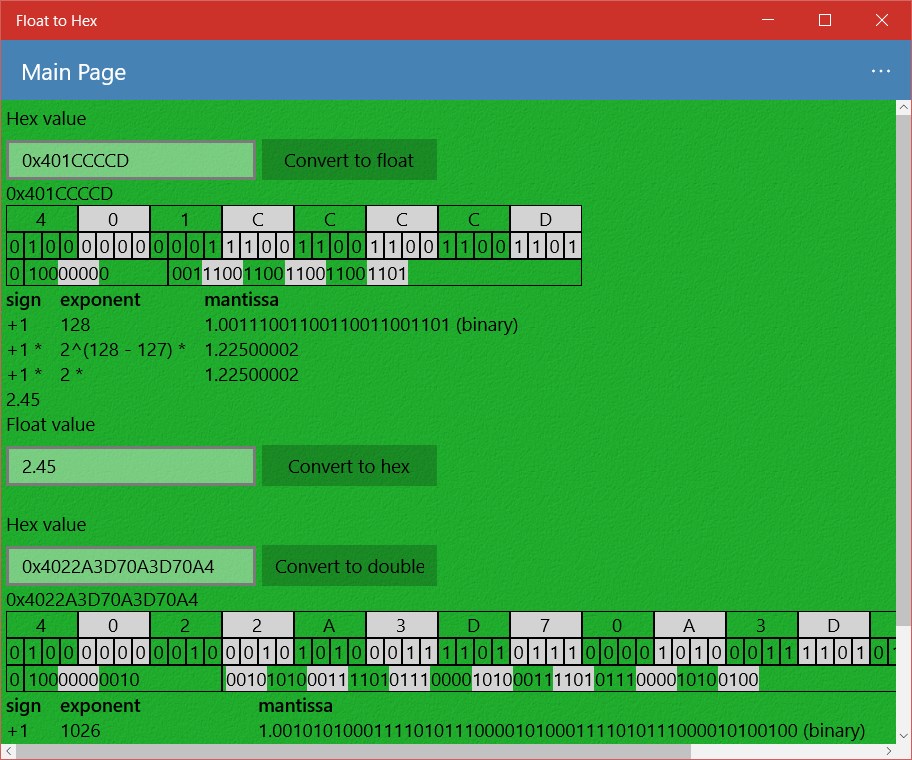 Convert between floating-point and hex valuesSee an explanation for how the conversion works!