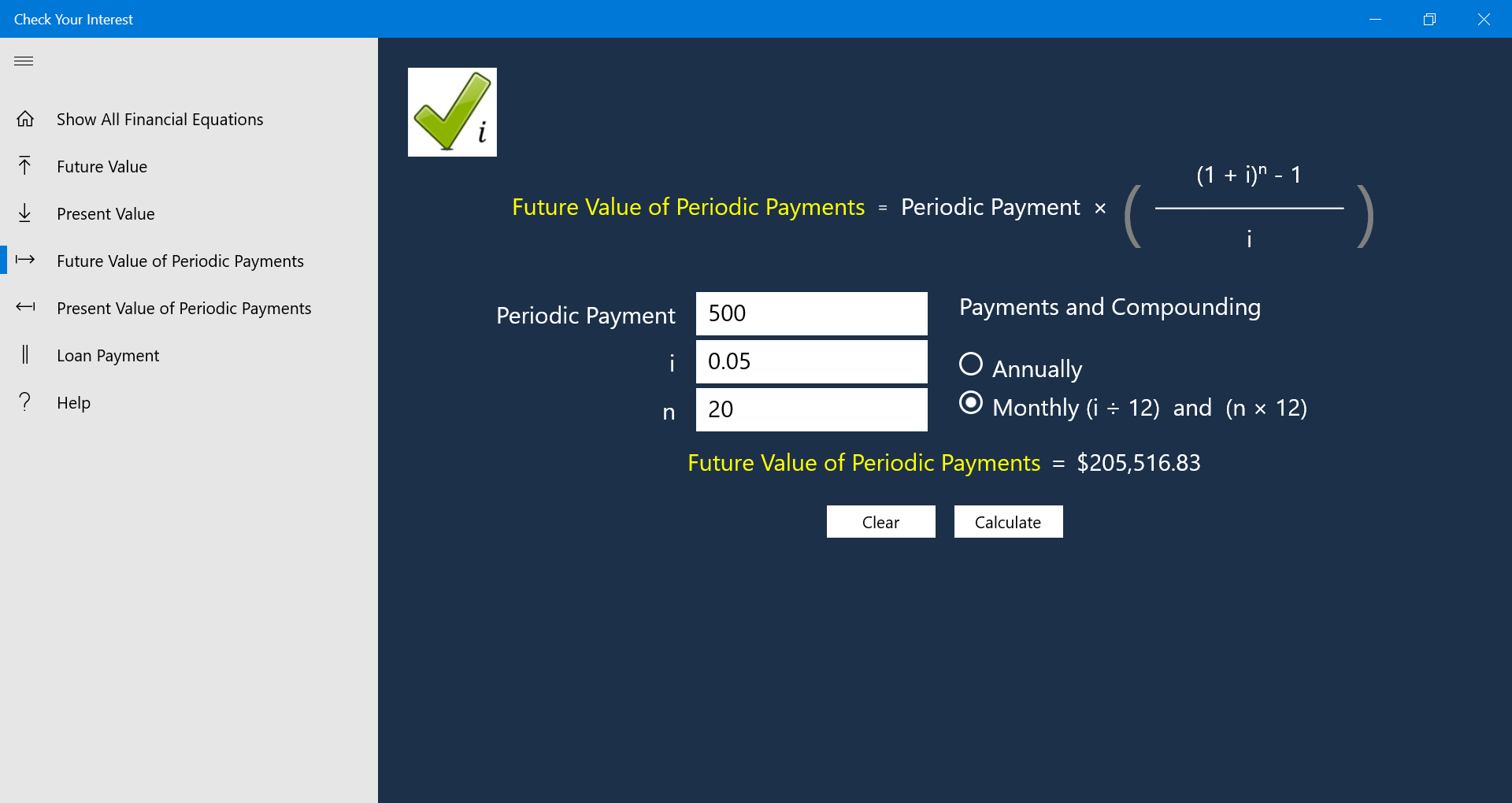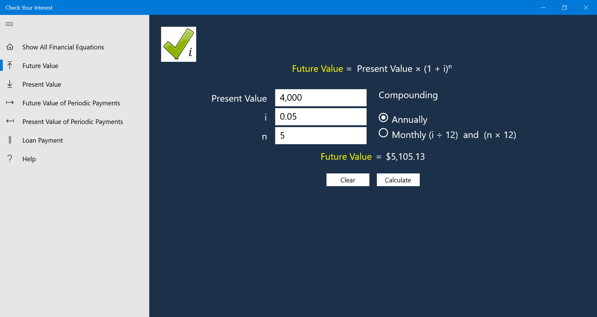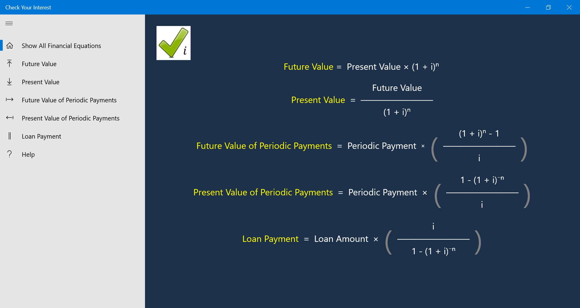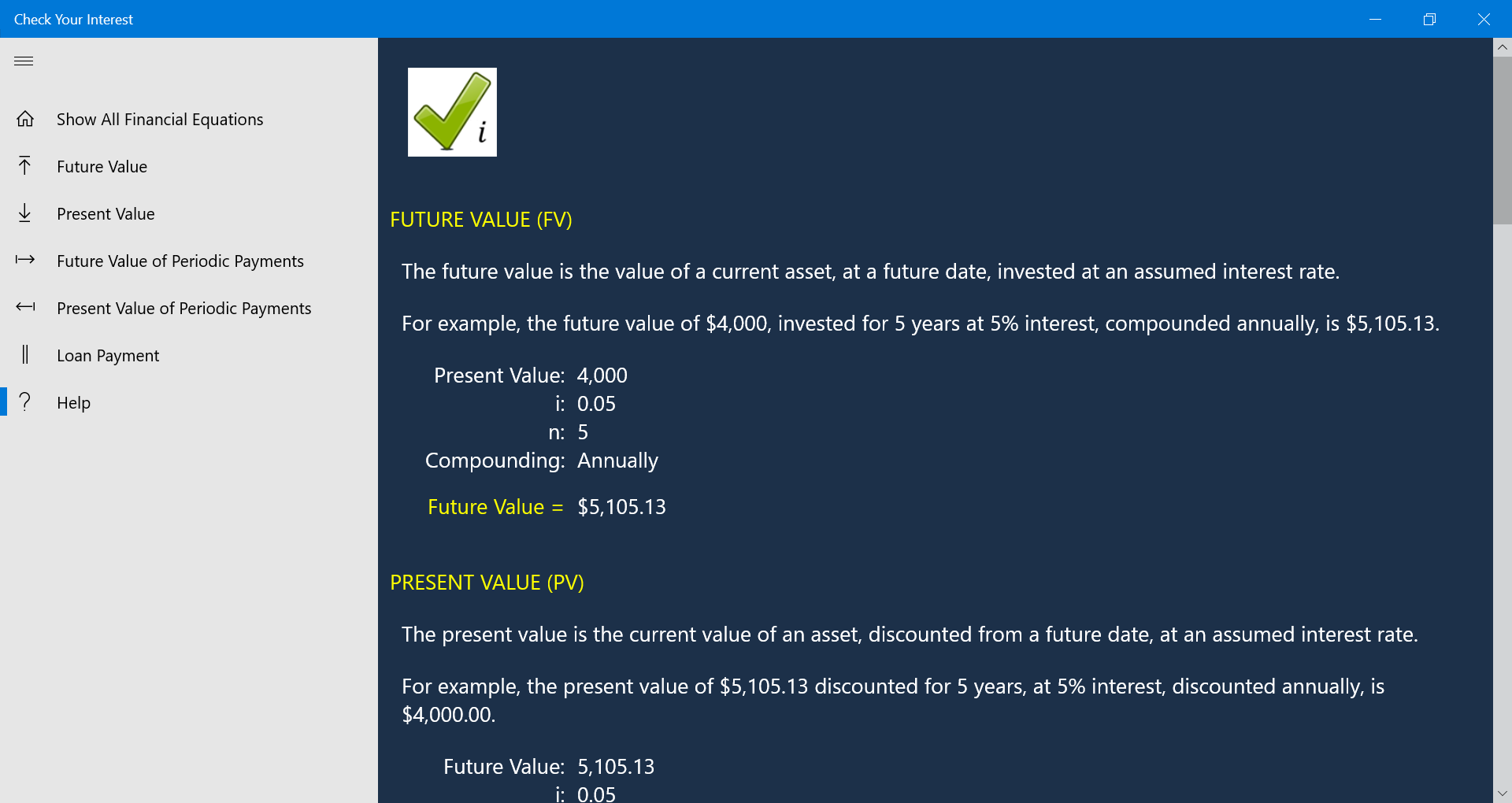 • Shows you the power of compound interest over time.• Helps you evaluate your financial assets with different interest rates and different investment periods.• Helps you learn about annuities.• Check Your Interest is educational, showing you each equation rather than making the calculations behind the scenes.• Discounts future assets to their present values, showing you how much you must invest today to reach future goals.• No advertisements.