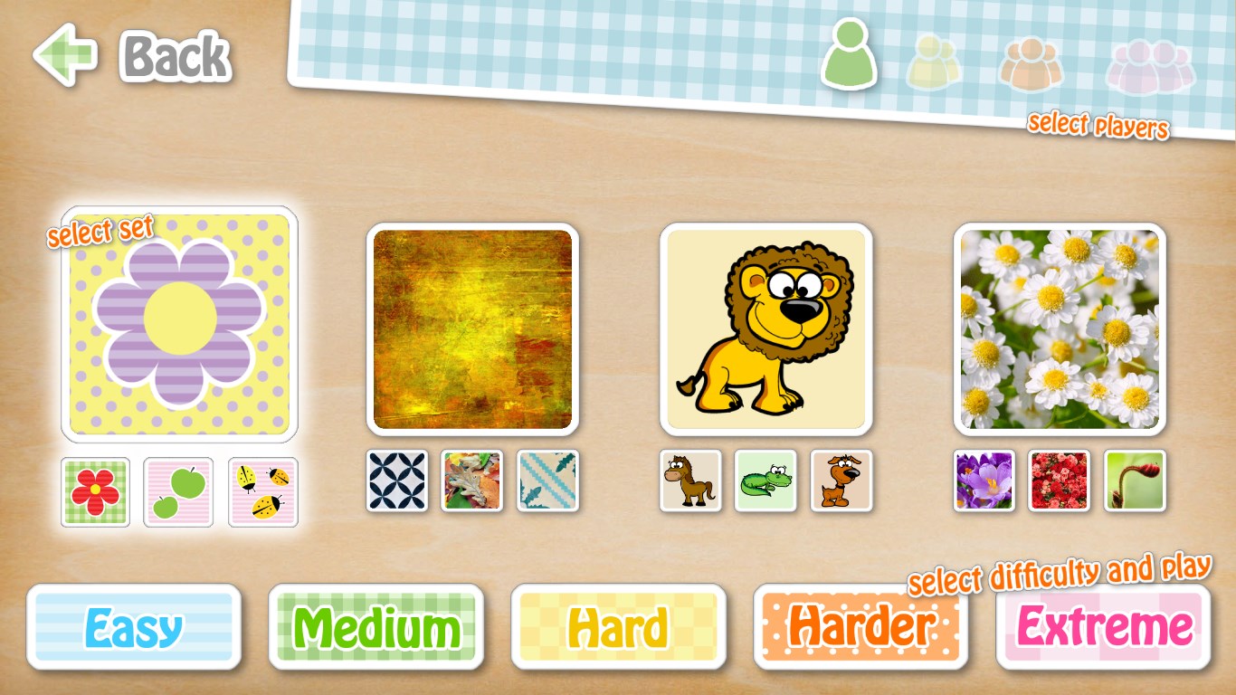 4 game modes (and more to come!)Single or multi-player mode (1-4 players)168 different pairs to match in 4 categories (and new coming soon!)3 to 42 pairs per game in 5 levels of difficultyBrilliant high quality graphics optimized for different resolutionsPlayful background music and sound effects