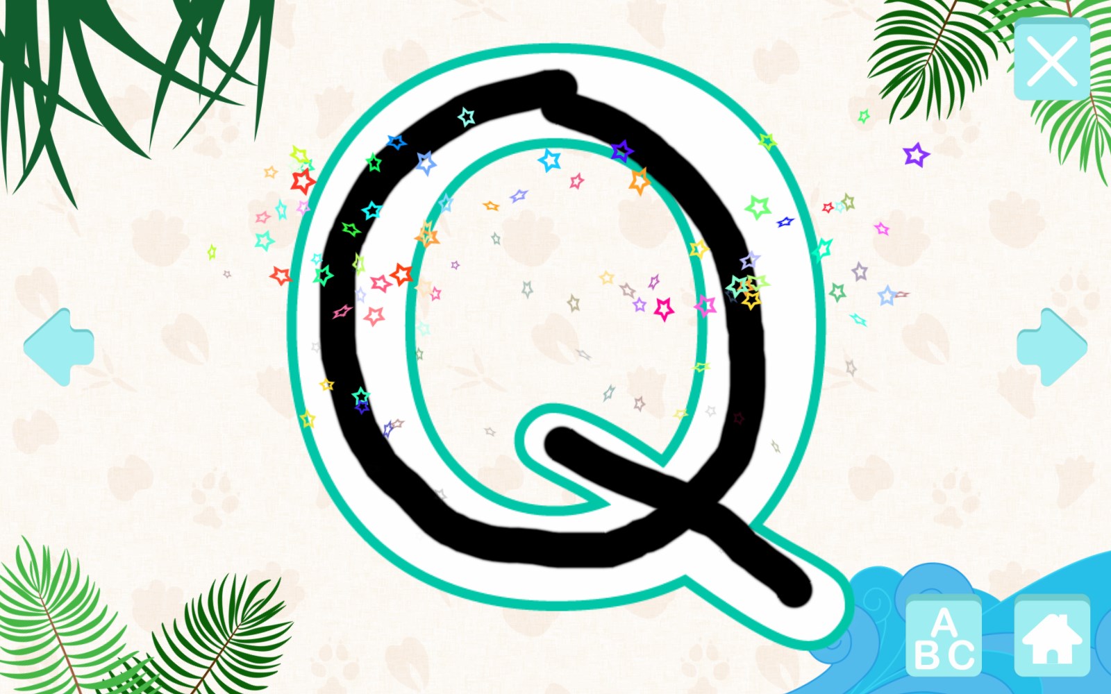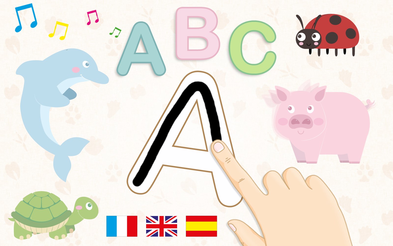 Activities that teach you how to draw alphabet\'s letters.Games to learn to recognize letters and animals.Discover the World\'s animals.Many languages available: french, spanish and english.Lovely graphics, funny animations and animals\' sounds.