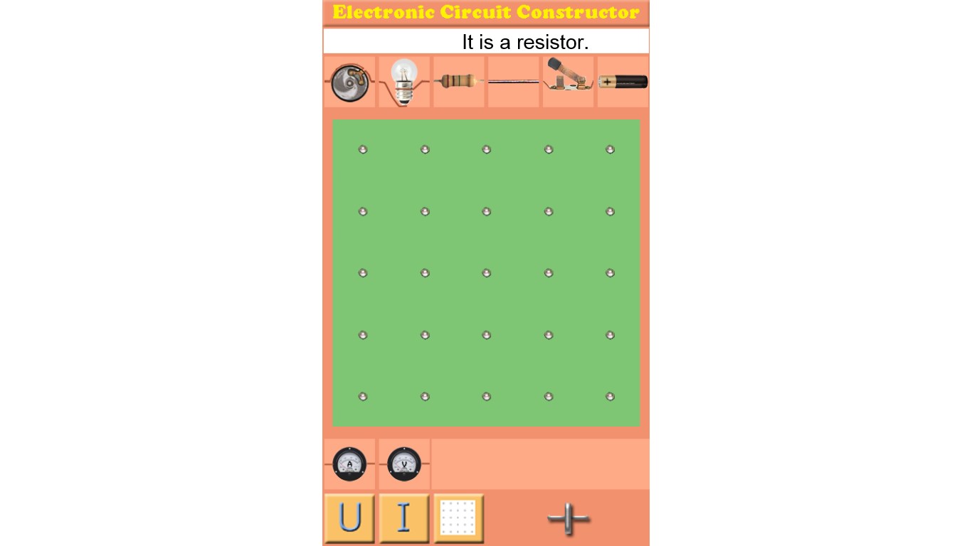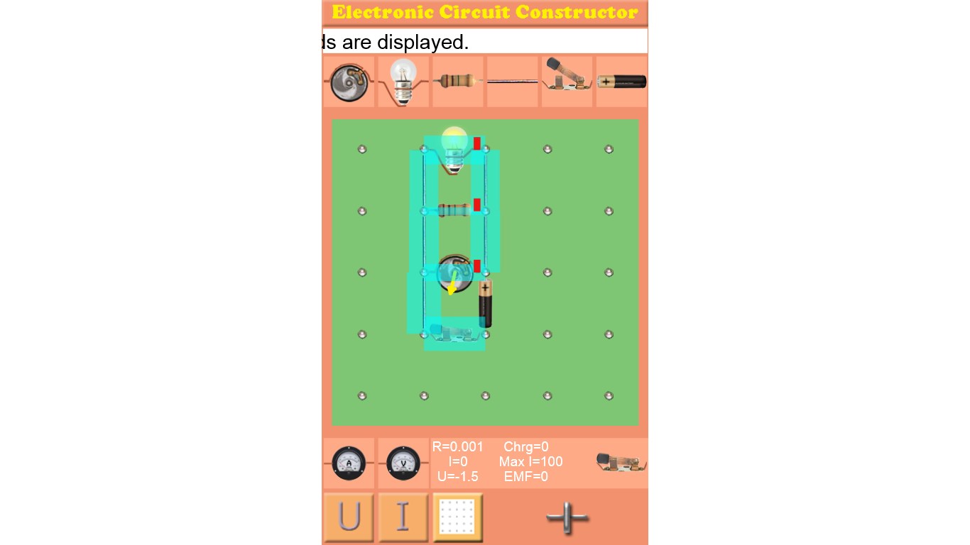There are easily recognizable control elements in the main workspace of the app. The upper row contains six simple electronic elements: a motor, a resistor, a wire, a switch, a cell and a lamp. The elements are draggable and can be placed on dielectric plate attached to contact points.