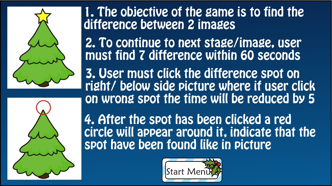 Cute image with christmas theme7 Different Images7 Spots to find each stageEach stage has 60 seconds time limitShare about the apps by Share CharmAutomatically paused when snappedPause button to pause the game manuallySupported different live tile text each stage