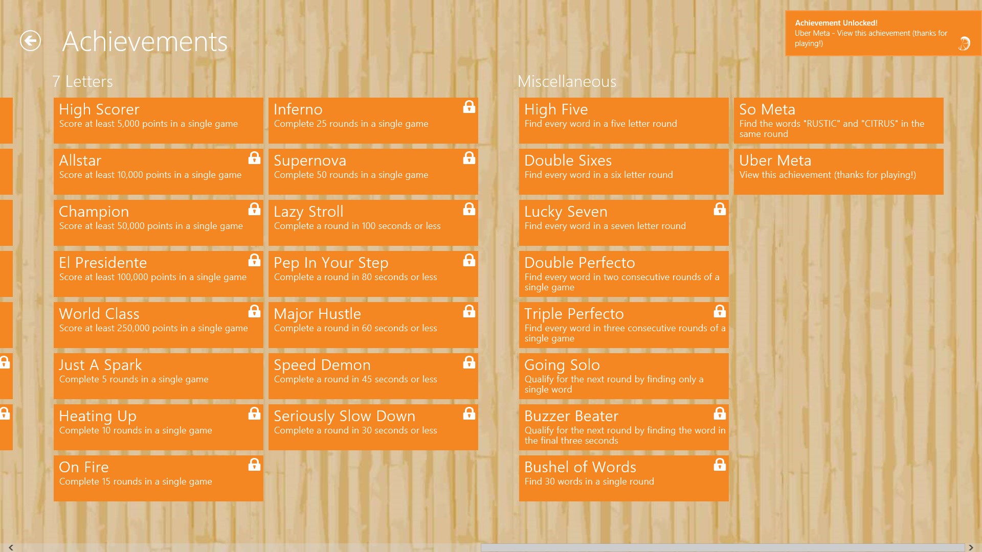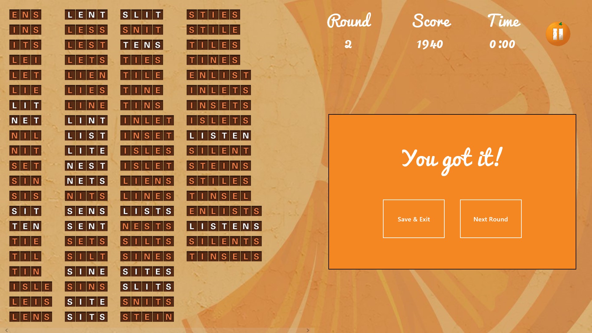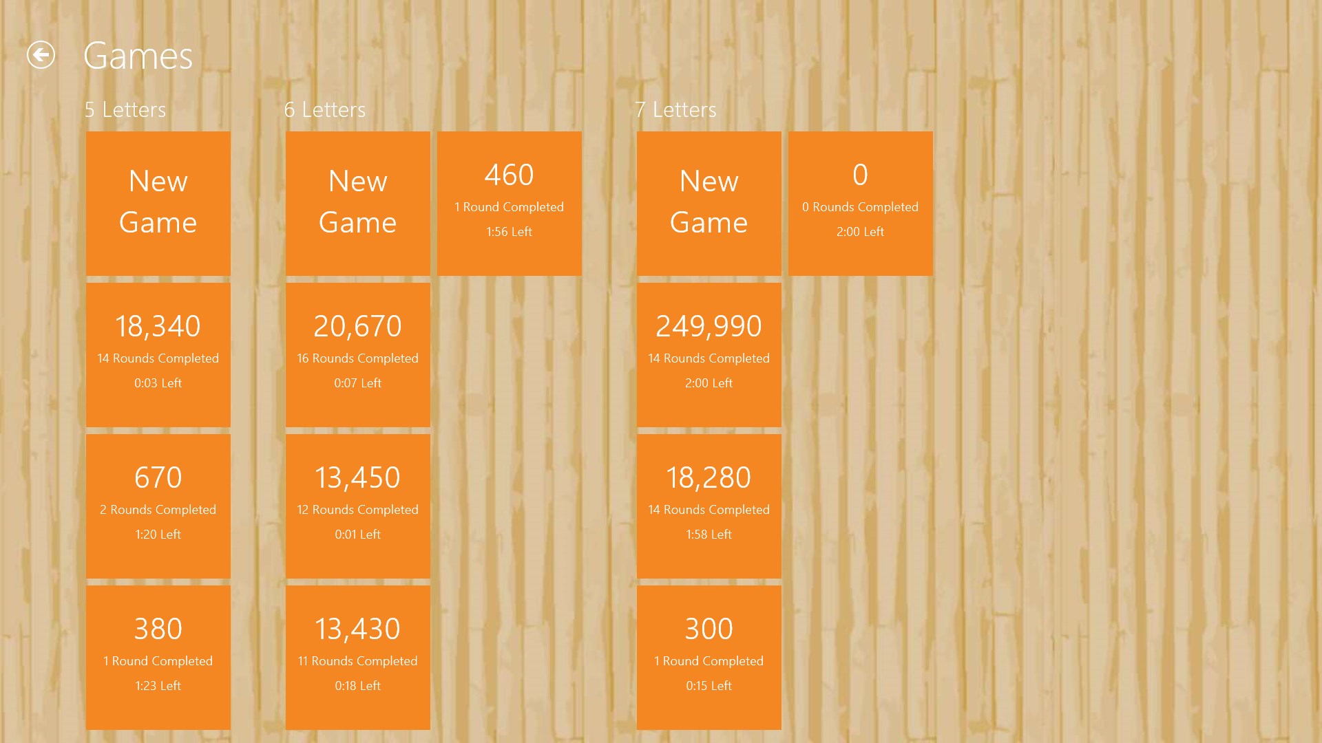 Rustic Citrus features an enormous dictionary of over 27,000 words so every game will be fresh like an orange. If you’re in the middle of a great run and you’re interrupted, don’t worry – you can save any number of games and return to them at any point. If you're up for the challenge, there are also 55 fresh achievements for you to earn. And if at last you just can’t get that one word, Rustic Citrus saves all your local high scores so you’ll know when you’ve gone further than ever before.