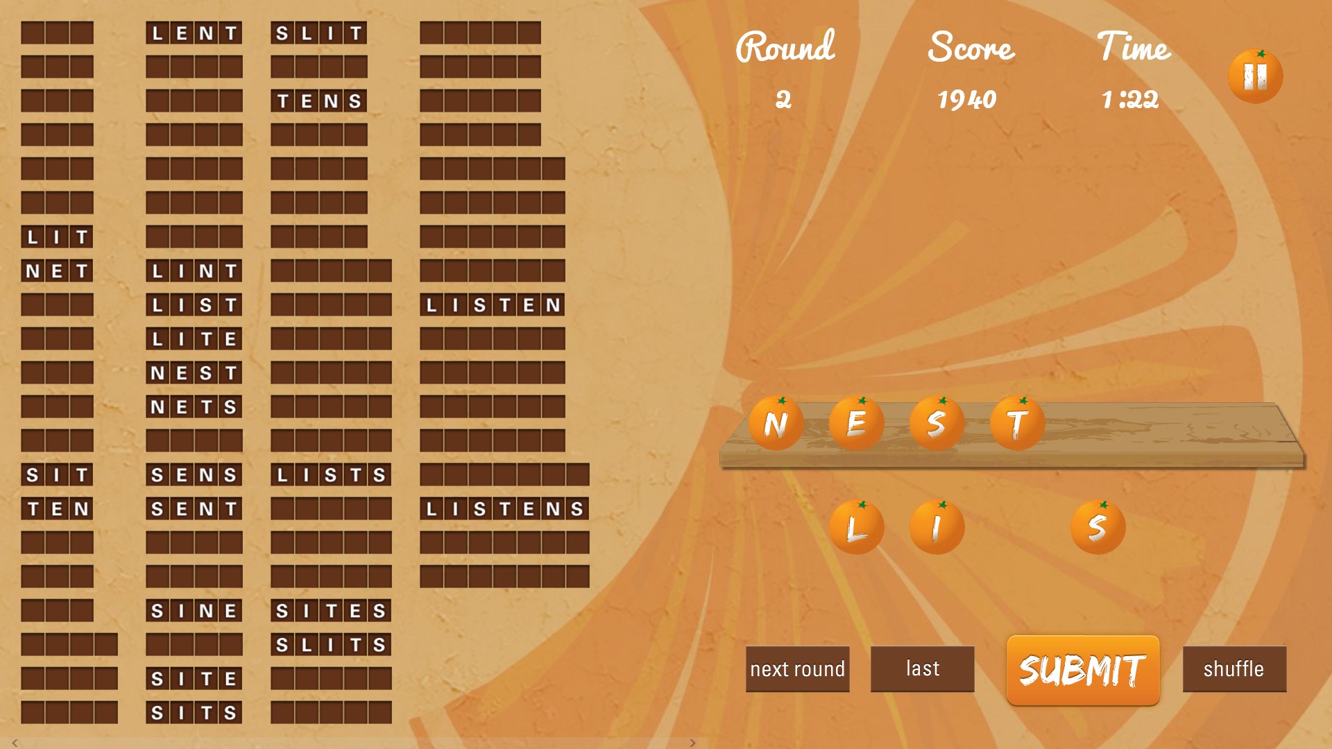 In Rustic Citrus, rush against the clock to make as many words out of a jumble of letters as you can. You gain points for building smaller words, but if you find the biggest word possible, you’ll advance to the next round and get a chance to build your score even higher! Start off with 5-letter jumbles, and if you’re feeling daring make the jump to 6-letter and even 7-letter games.
