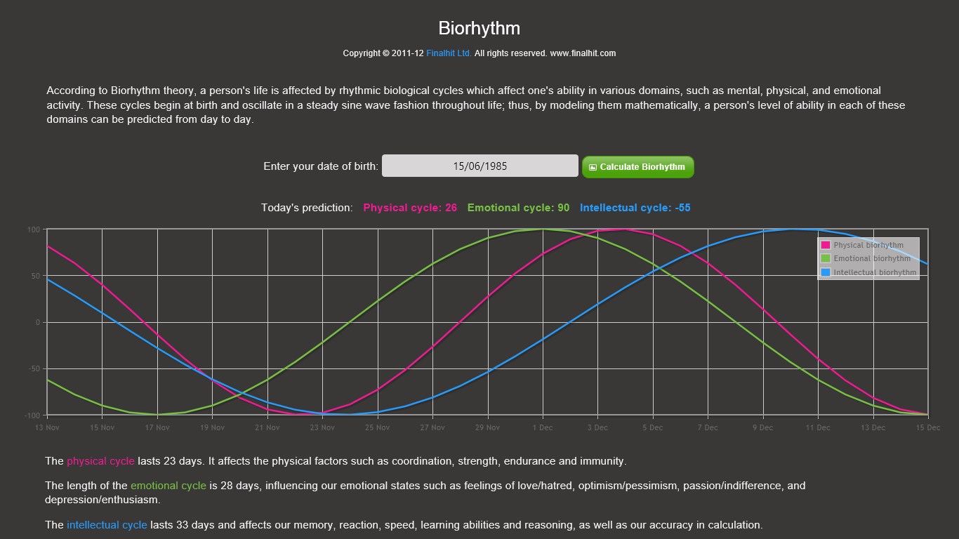 A person's life is affected by rhythmic biological cycles which affect one's ability in various domains. These cycles begin at birth and oscillate in a steady sine wave fashion throughout life; thus, by modeling them mathematically, a person's level of ability in each of these domains can be predicted from day to day.
