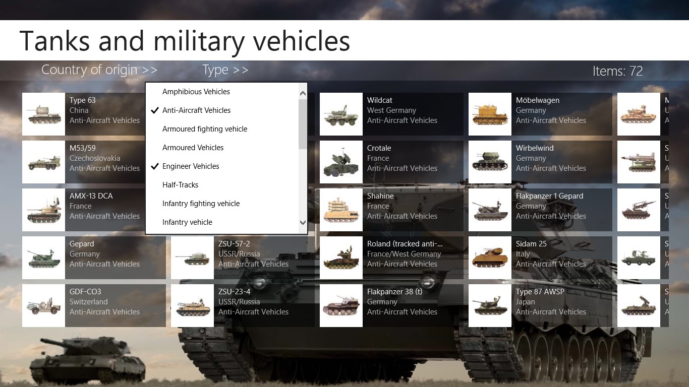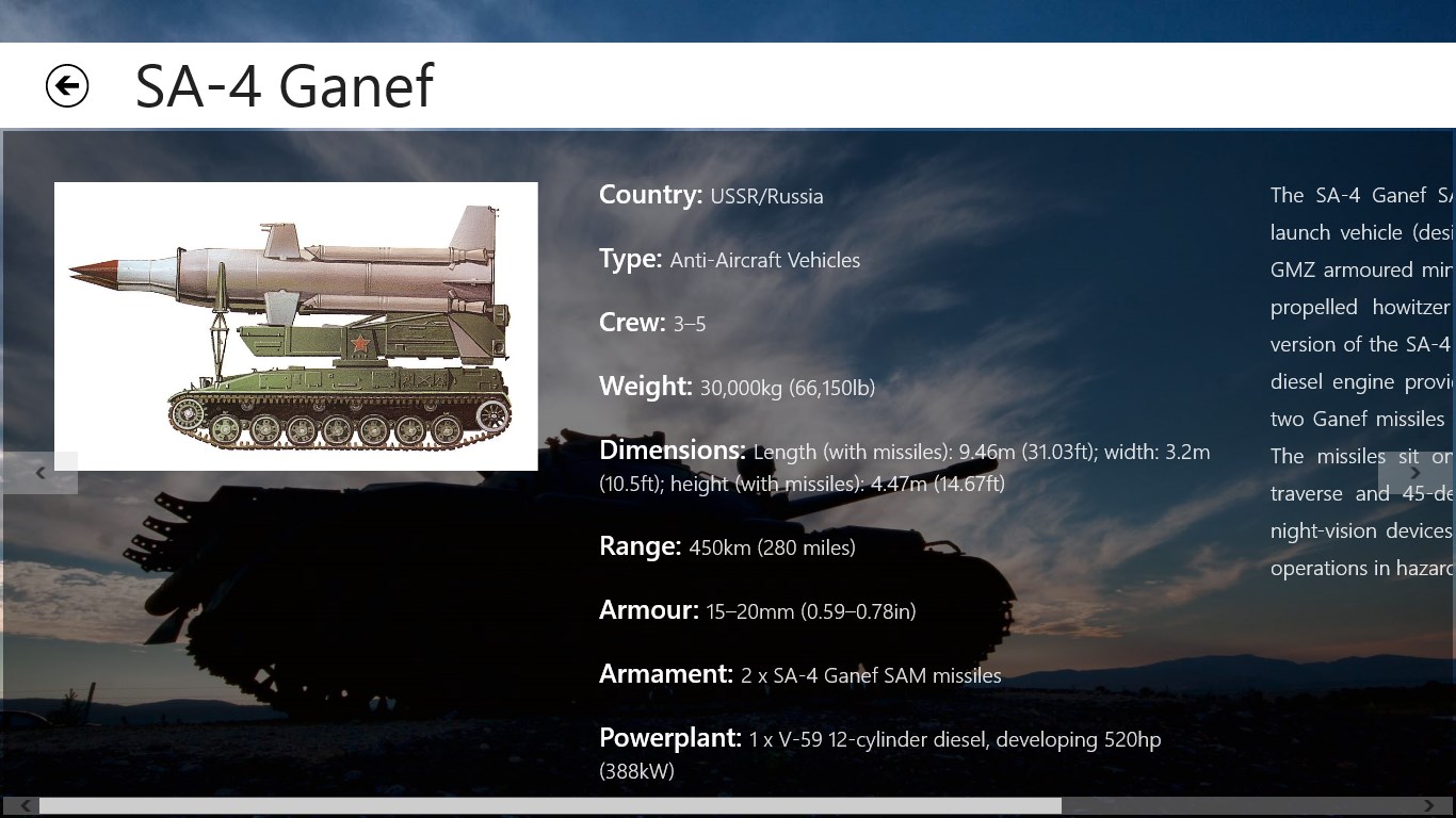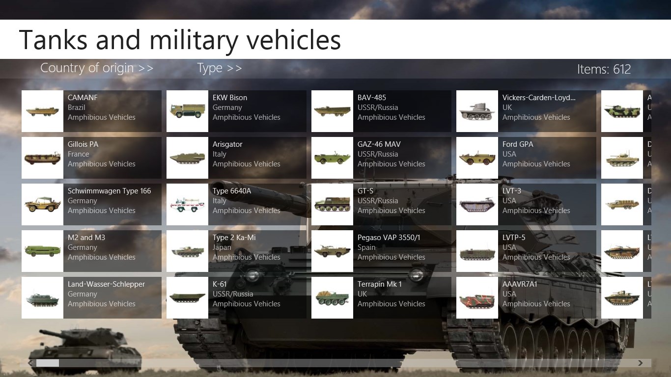 Almost 600 military vehicles featured, each one illustrated by a full-colour artworkMajor tanks and support vehicles from World War I to the present includedFull crew, dimensions and weights provided for each vehicle, all measurements in imperial and metricFavourites sectionQuick search functionsAll data stored offline on your device. No Internet connection required