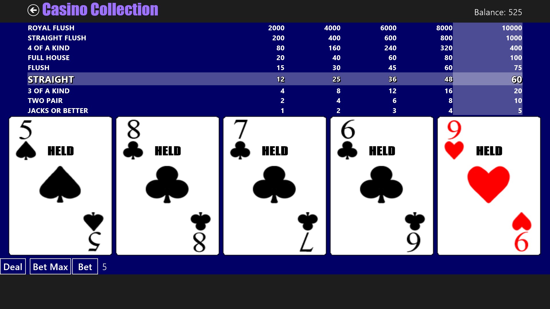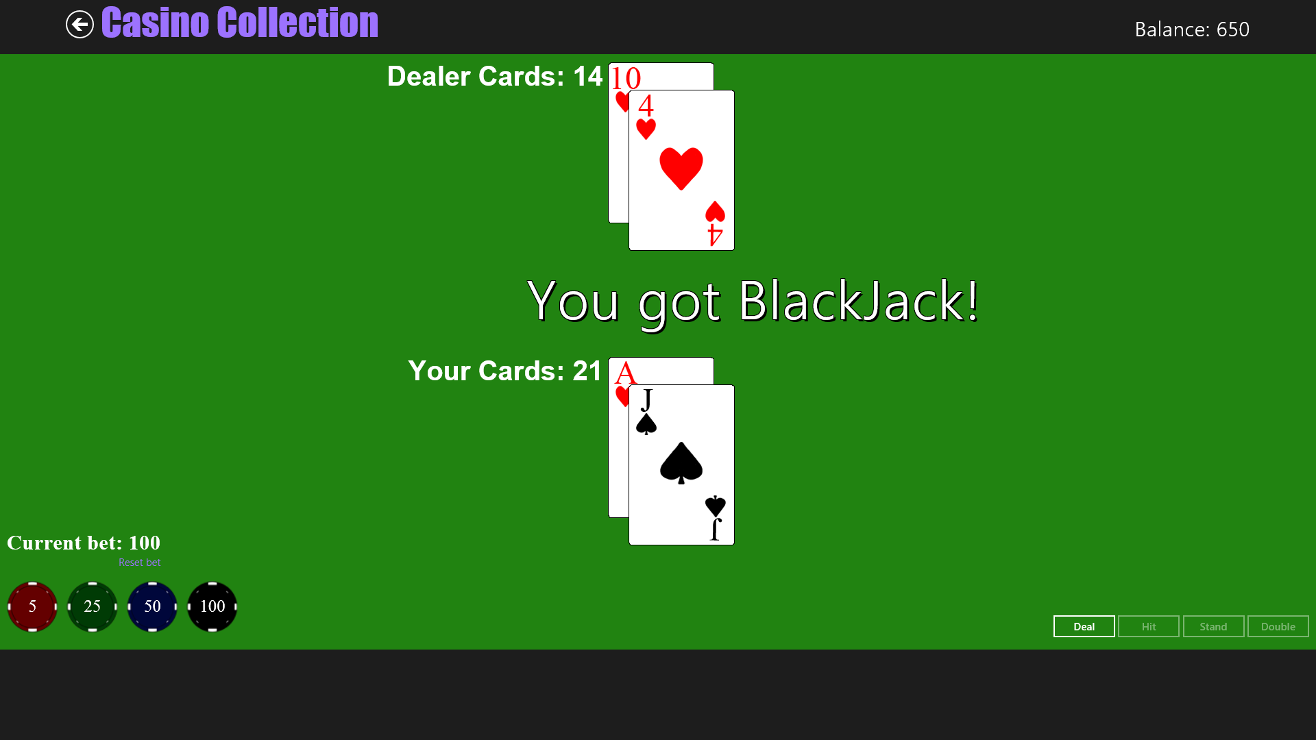 Play multiple casino games including Blackjack and Jacks or Better. No need for switching between apps. Your balance is shared between games to give you a realistic betting experience. Instructions available for all games. See how much you can win today!