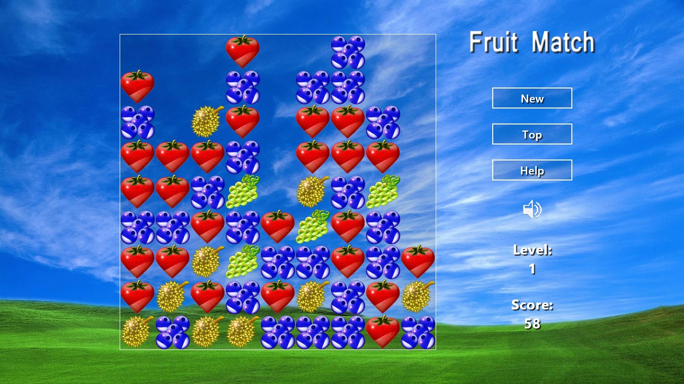 "Fruit Match" is a simple but addictive puzzle game. Match the same kind adjacent fruits by tapping on them. Blocks of at least 3 pop. The more fruits you pop in a tap, the more points you get. After every pop the fruits without support drop down. If there is no block to tap, the game proceed to next level and blank positions will be filled with new fruits. If the board is full but there is no adjacent fruits of at least 3, the game is over.