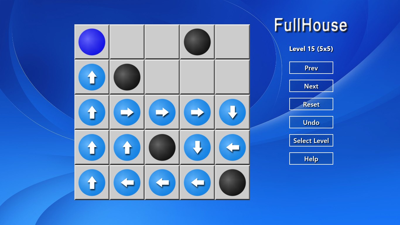 FullHouse, also known as FullBoard, is a puzzle invented by Erich Friedman in 2004. The object of game is to draw a path through all the empty squares, passing through each exactly once. The path moves horizongtally or vertically, can only change direction when it hits a blocked square or the edge of the grid.