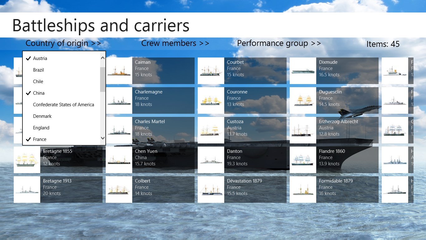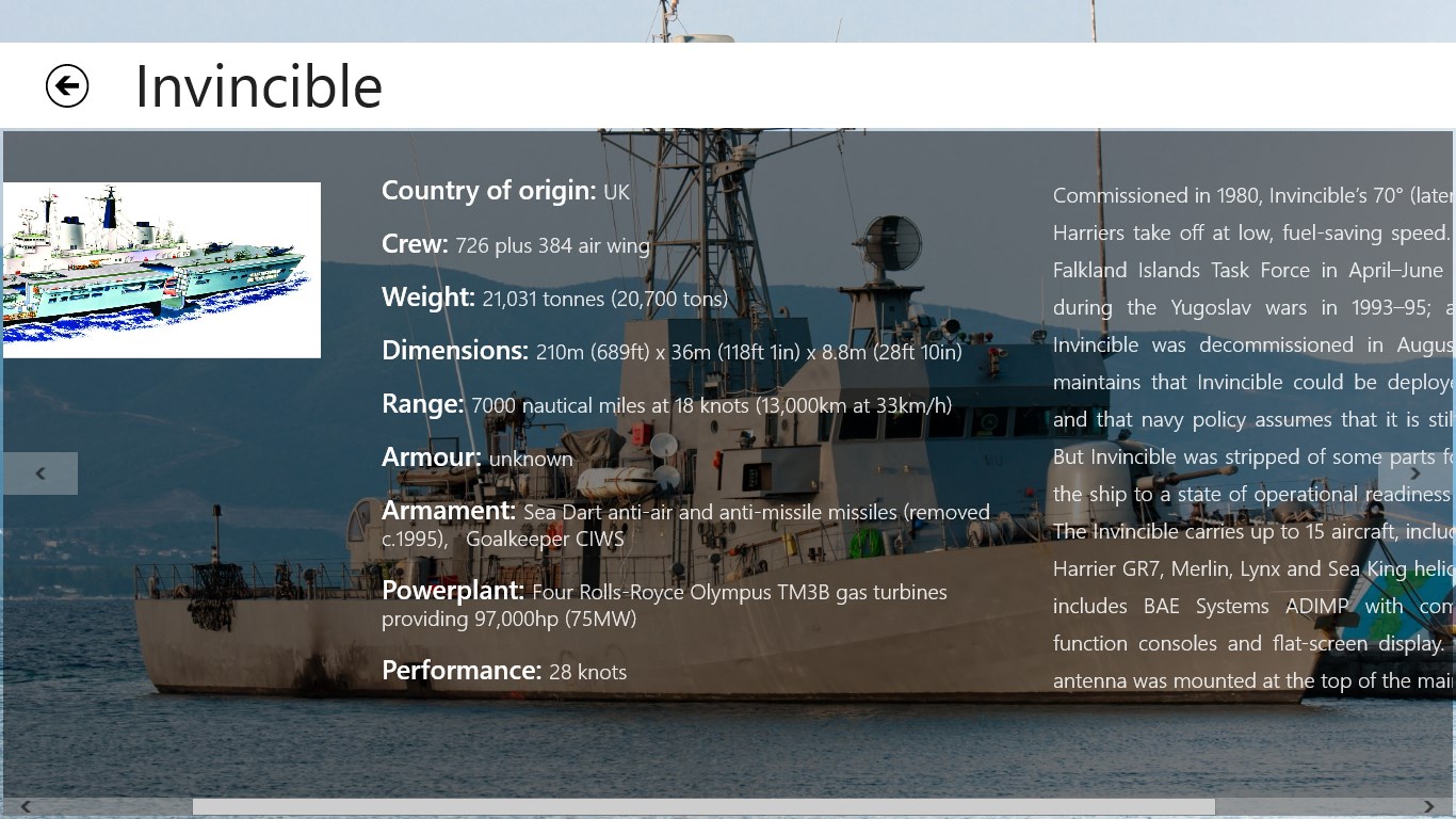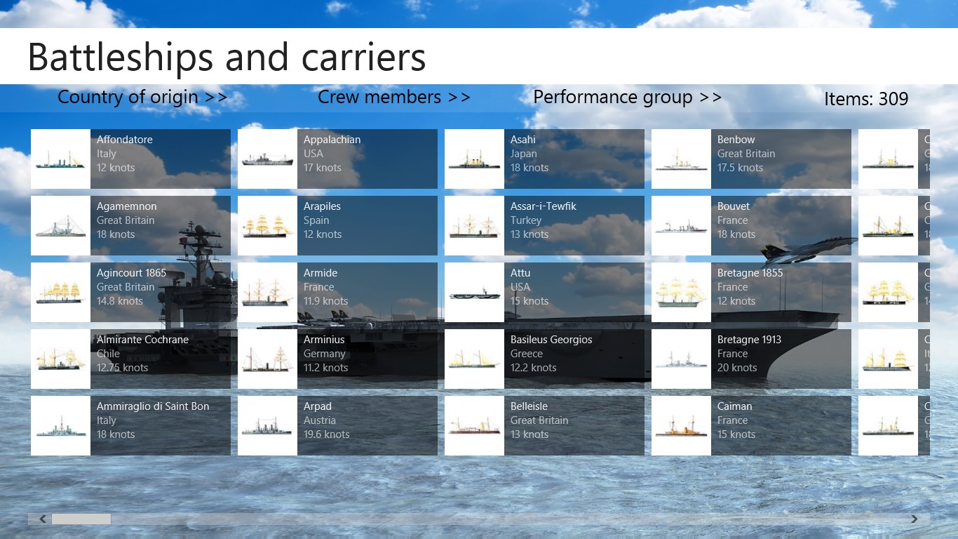 Battleships and Carriers contains 300 of the most important and influential capital ships to have sailed the seas since the age of sail. These include such famous battleships as the Admiral Graf Spee, Bismarck, Iowa and Dreadnought. The app also includes the greatest aircraft carriers that served during World Wars I and II.