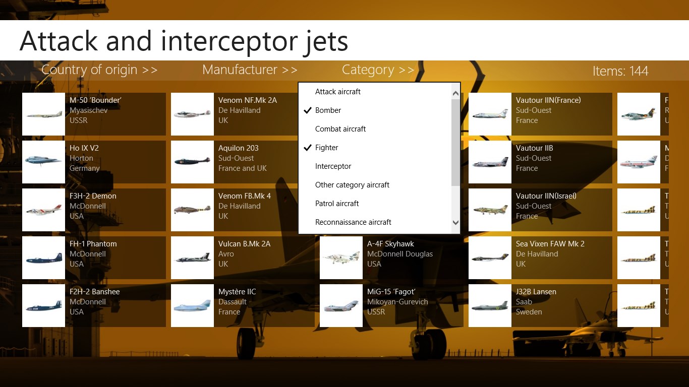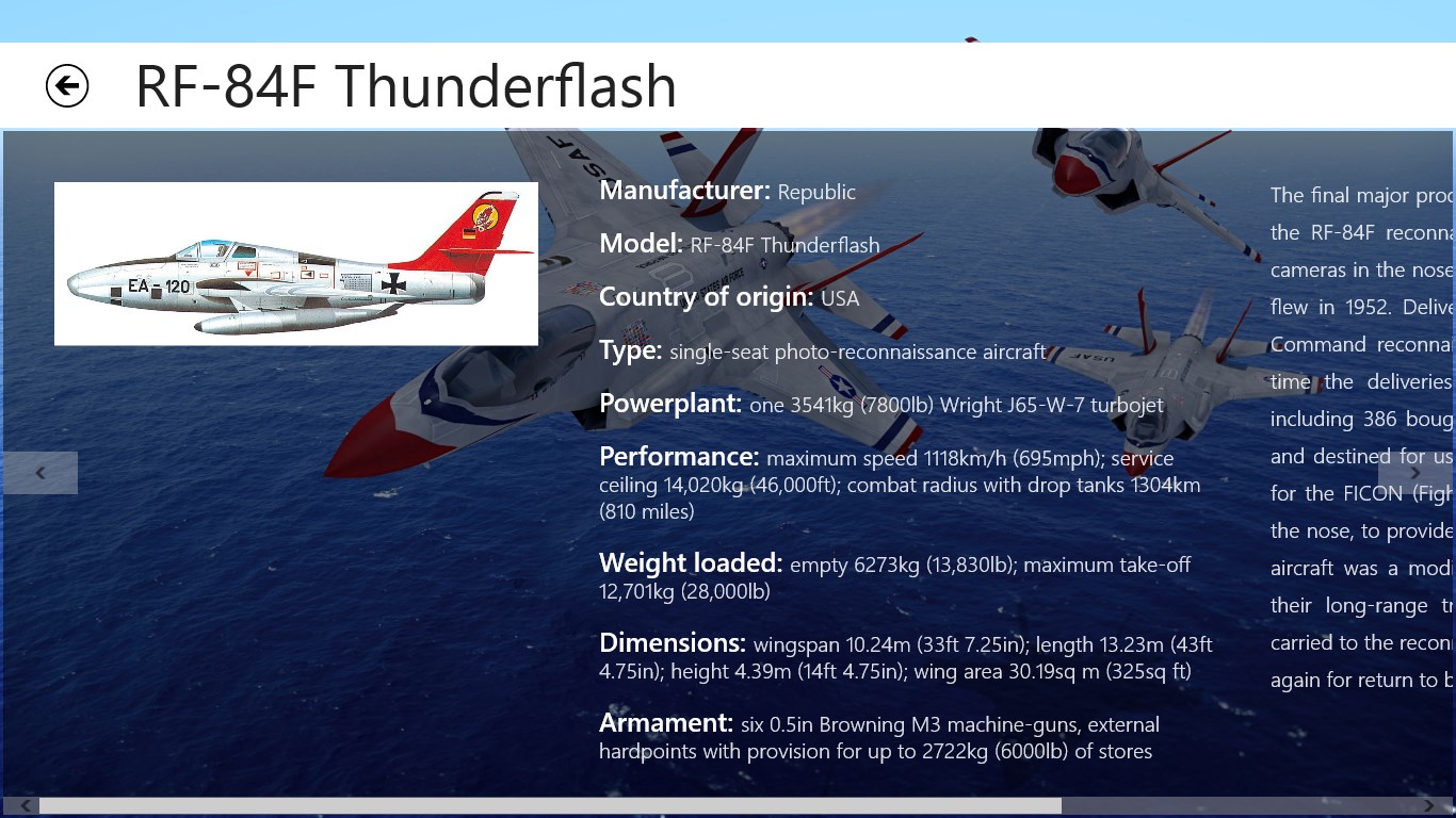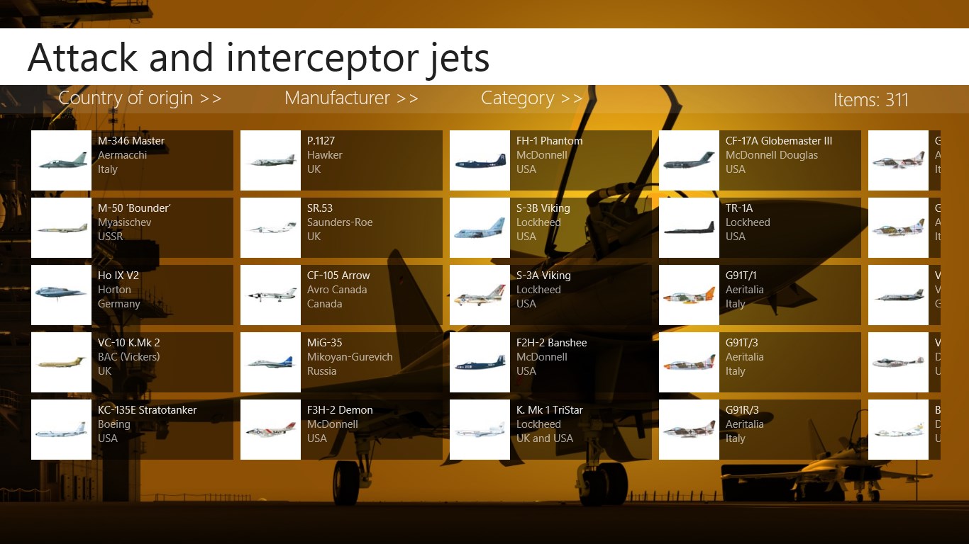 300 military jet aircraft featured, each one illustrated by a full-colour artworkFull dimensions, weights, armament and powerplant details provided for each aircraft, all measurements in imperial and metricEach aircraft\’s development history and career in fullQuick search functions for country and manufacturerFavourites sectionAll data stored offline on your device. No Internet connection required