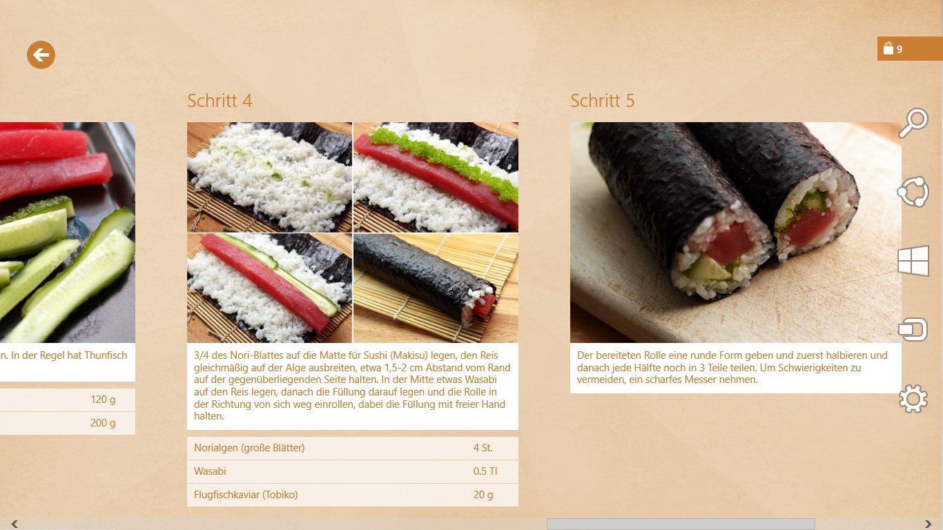 Die 480 Rezepte der App wurden zur besseren Übersicht auf verschiedene Kategorien aufgeteilt. Auf diese Weise ist es ein Leichtes, Zubereitungsanweisungen etwa für Eierspeisen, Fisch und Meeresfrüchte, Fleischgerichte, Getränke, Grützen, Kuchen, Pasta oder Pilzgerichte zu finden. Auch Pizza-, Reis-, Soßen- und Suppenrezepte sind im Fundus präsent. Intensiv beschäftigt sich der "Rezeptefan" auch mit Sushi und Sashimi, mit Kuchen und Torten sowie mit Vorspeisen aller Art.