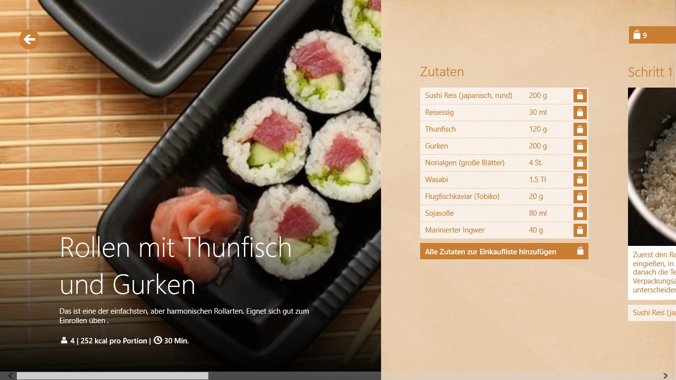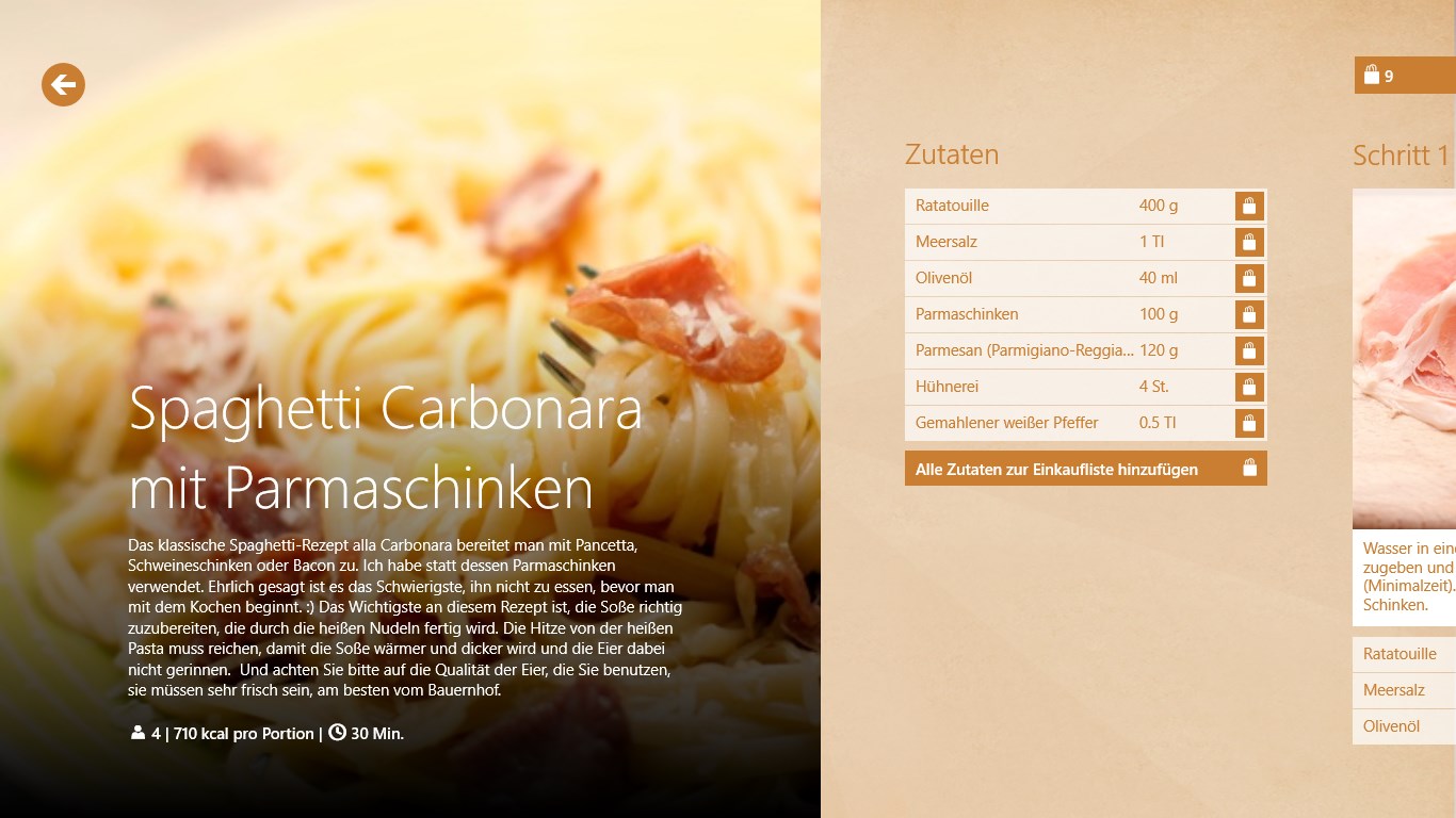 Sobald ein Rezept geöffnet wird, zeigt der "Rezeptefan" ein Foto vom fertigen Gericht, die Kalorien pro Person und den Zeitbedarf für die Zubereitung. Eine Zutatenliste mit Mengenangaben lässt sich gern in einen Warenkorb übernehmen. Er hilft später beim gezielten Einkaufen gern auch für mehrere Gerichte.