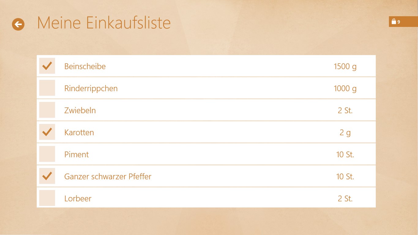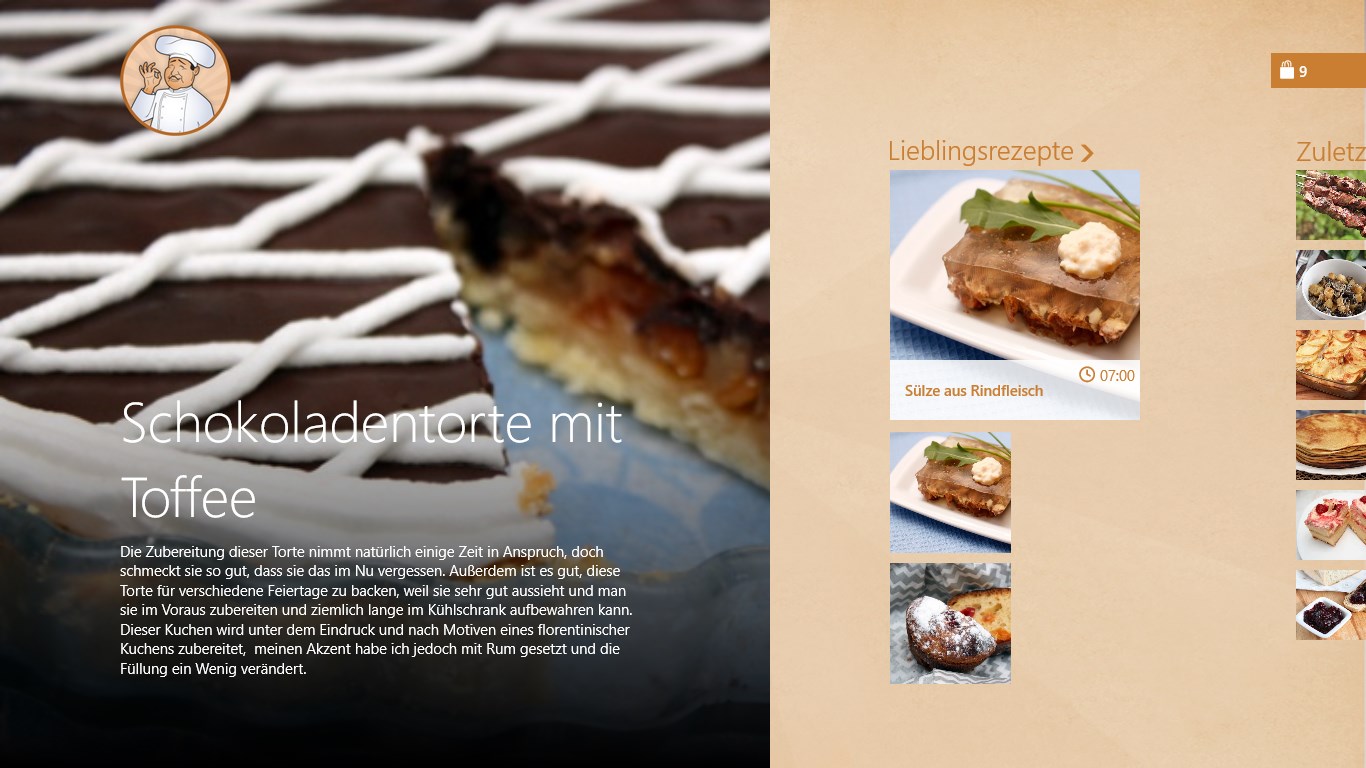 480 Rezepte aus vielen KategorienMit Zutatenliste und EinkaufszettelSchritt-für-Schritt-Anleitung für jedes RezeptJe ein Foto pro ArbeitsschrittAssistent zeigt Rezepte passend zum KühlschrankinhaltÜber 3.500 Fotos in der App verfügbarEine Liste mit Liblingsrezepten kann erstellt werdenKalorien pro Person und der ZeitbedarfTimer-Funktion