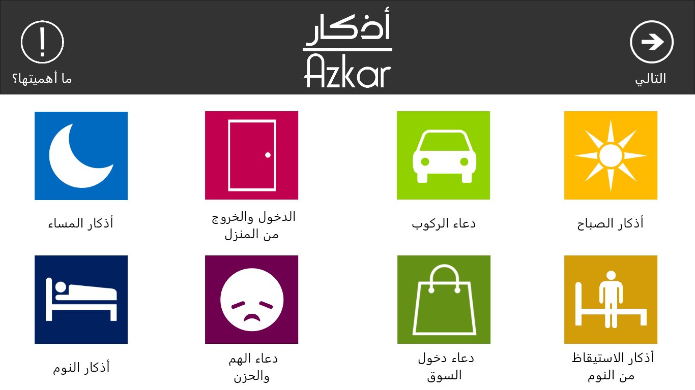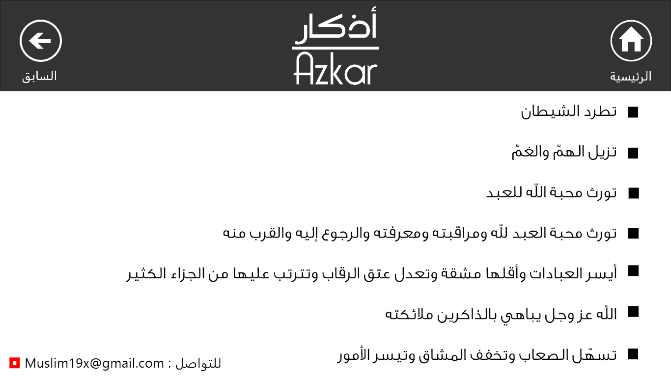 أفضل برنامج للأذكار الإسلامية على متجر الويندوز | تطبيق أذكار مجاني وسهل الاستخدام | يشمل الأذكار والأدعية المهمة من الكتاب و السنة | أذكار الصباح، أذكار المساء، أذكار النوم، أذكار الأذان، وأذكار ما بعد الصلاة، دعاء صلاة الاستخارة والعديد من الأذكار الأخرى | الرجاء الدعاء للقائمين على هذا العمل بالتوفيق والهداية || للتواصل: [email protected]