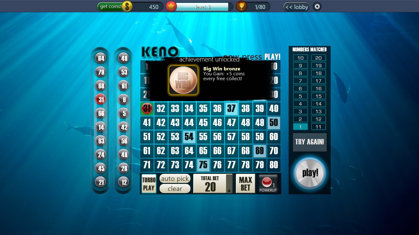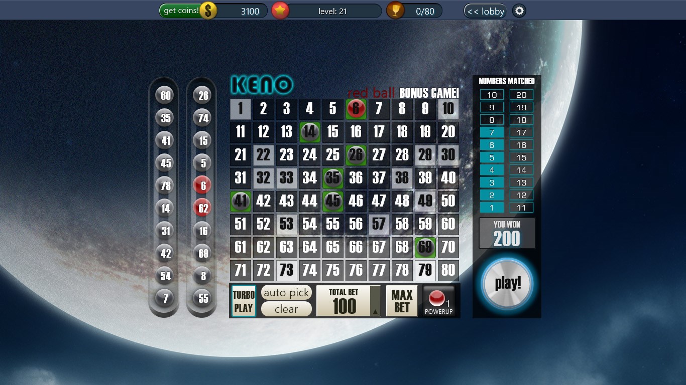 Generous range of payouts so you don\’t wait forever to winUnlock secret mini game roomsGet free coins every 4 hoursPlay red powerballs for powerup bonuses to increase your chance to winLevel up to get access to more and more features!Pick between 1 and 20 numbers (\“spots\”) out of a pool of 80 numbers and see how many you match!Or use the autopick feature to select balls for you, and play consecutive bet chancesClear picks to find new lucky combosOr keep the same picks without having to re-select numbers every spinTurbo mode to play your game fasterPlay Keno and unlock up to 4 rooms