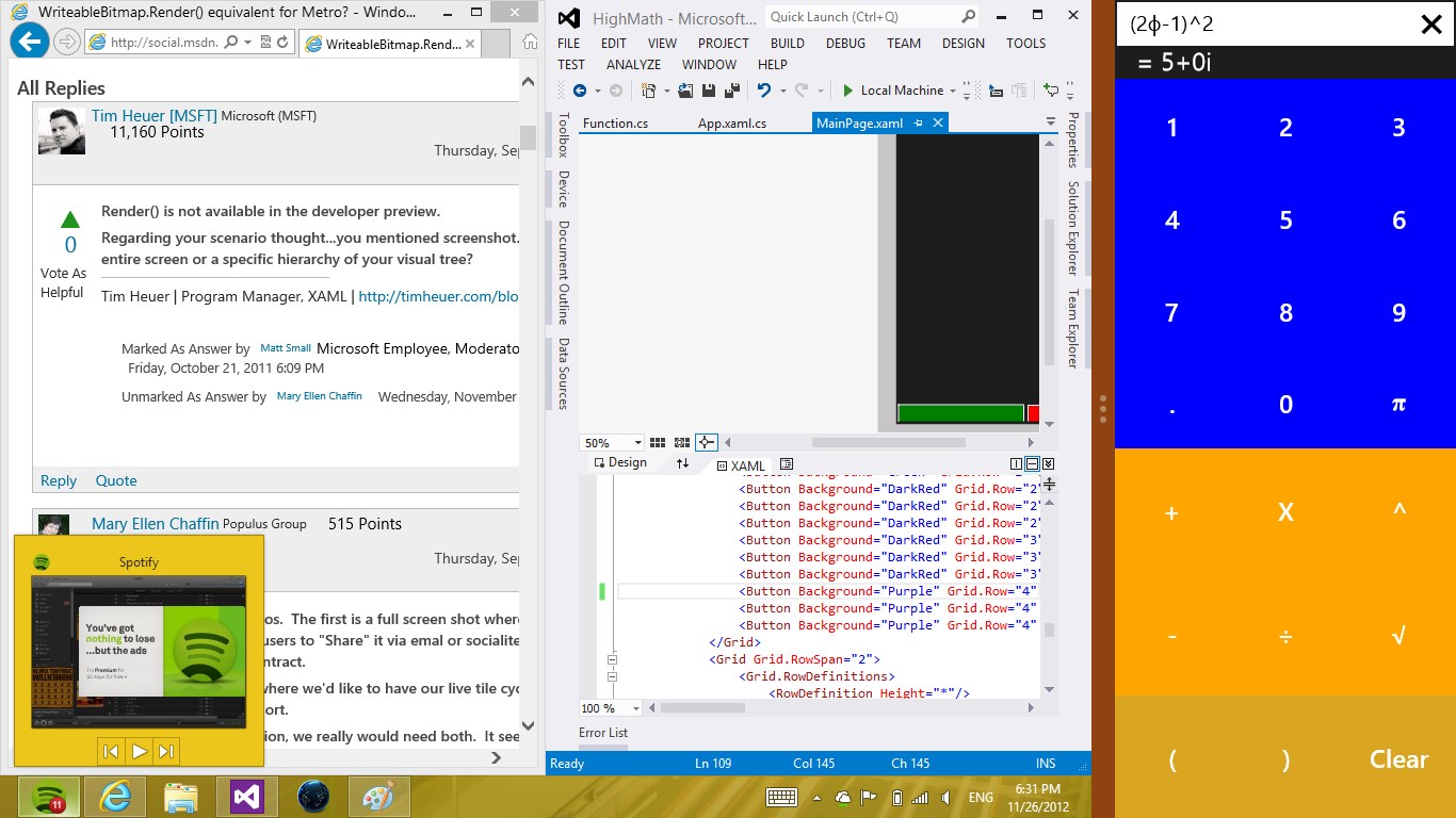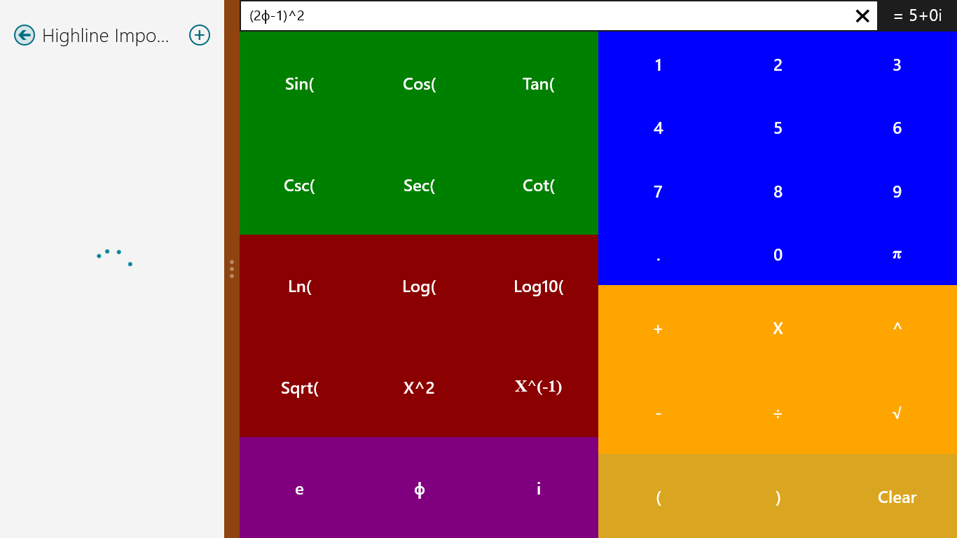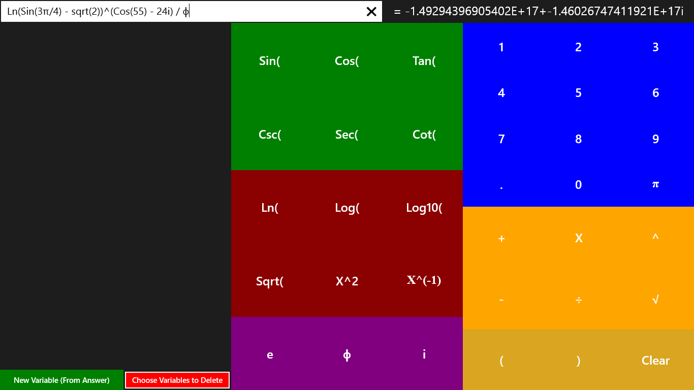 This is a calculator app for Windows 8 and Windows RT that can handle complex calculations, including raising complex numbers to complex powers, and taking sines and cosines of complex numbers.