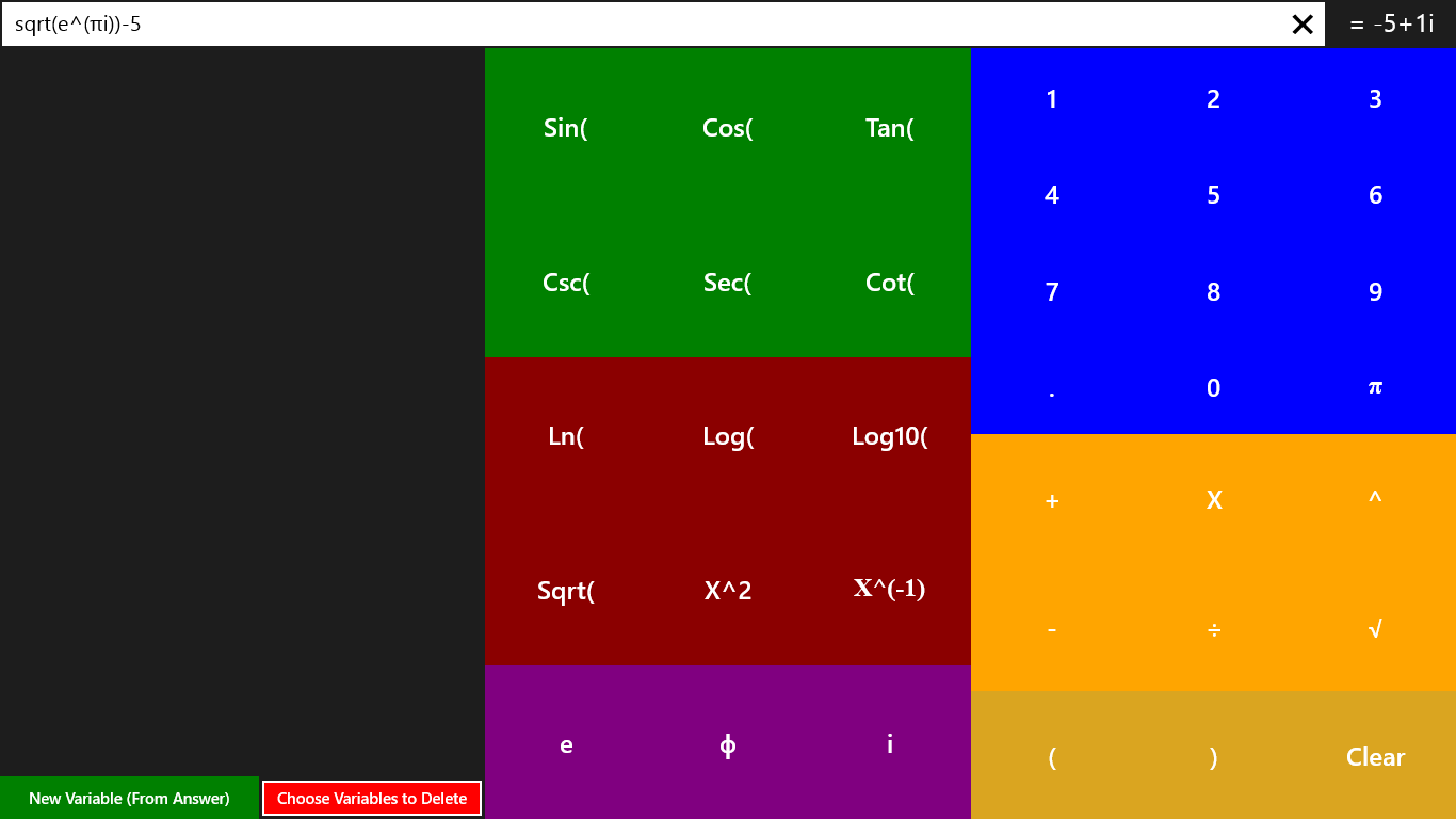 Make calculations using complex numbersBasic arithmeticTrig functionsLogarithm functionsSquare rootPi and phiAssign values to "variables"