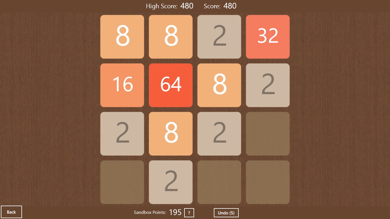 8 default boards to playMake your own 2048 boards with the board editorPin any board to the start screen, where the live tile shows an image of your board and progressMake a mistake? Use sandbox points to undo moves.Smooth animations make the game flow like no other.