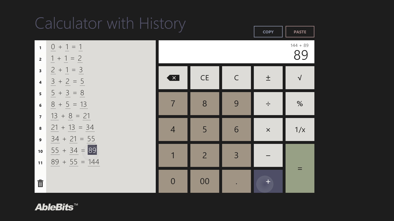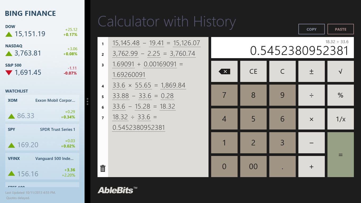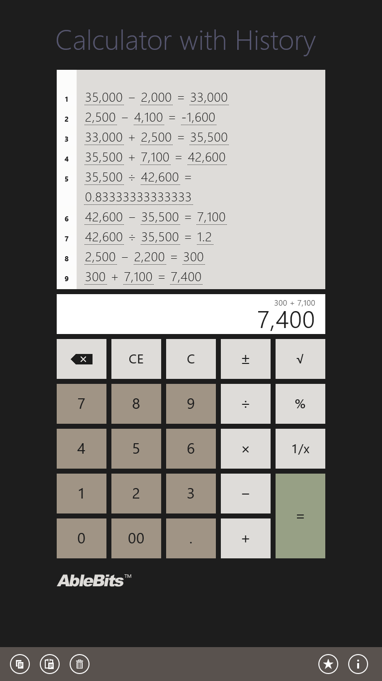 Calculation history listTap to use recent calculationsHave snapped view support with calculations history displayedHave filled view support with calculations history displayedBig numbersUse external keyboardCopy and paste via clipboardGet landscape mode supportPortrait mode support with calculations history displayedMetro style