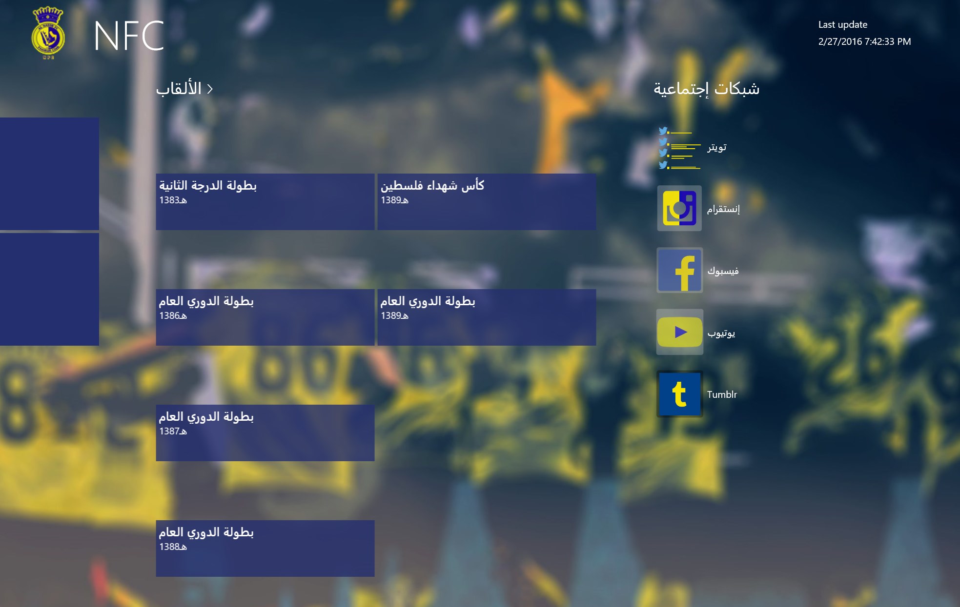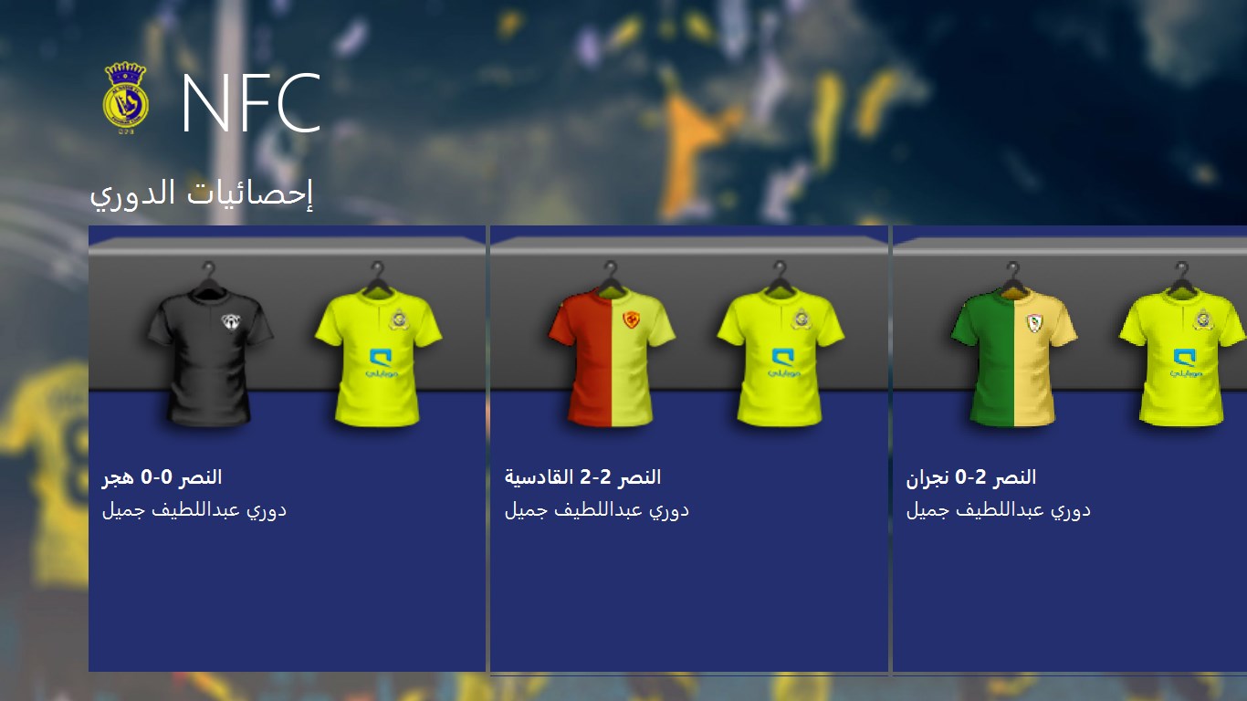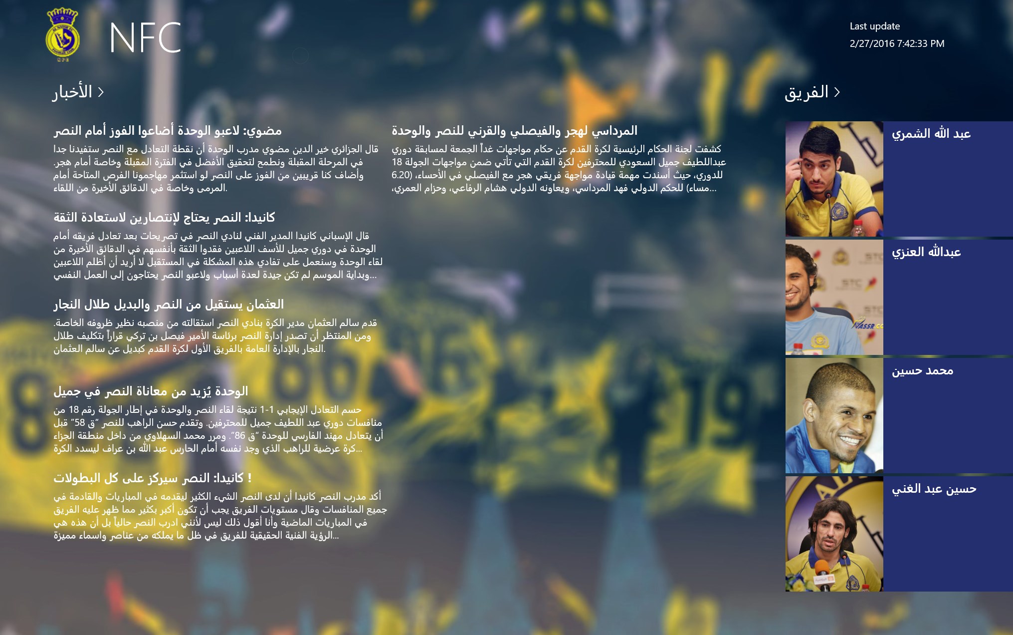 تطبيق غير رسمي يخص أخبار نادي النصر العالمي و تجد فيه كل مايخص النادي من معلومات و أخبار و مقاطع فيديو و حتى صور للاعبين و كل مايخص النادي على الشبكات الاجتماعية (تويتر,انستقرام ,يوتيوب ,فليكر)