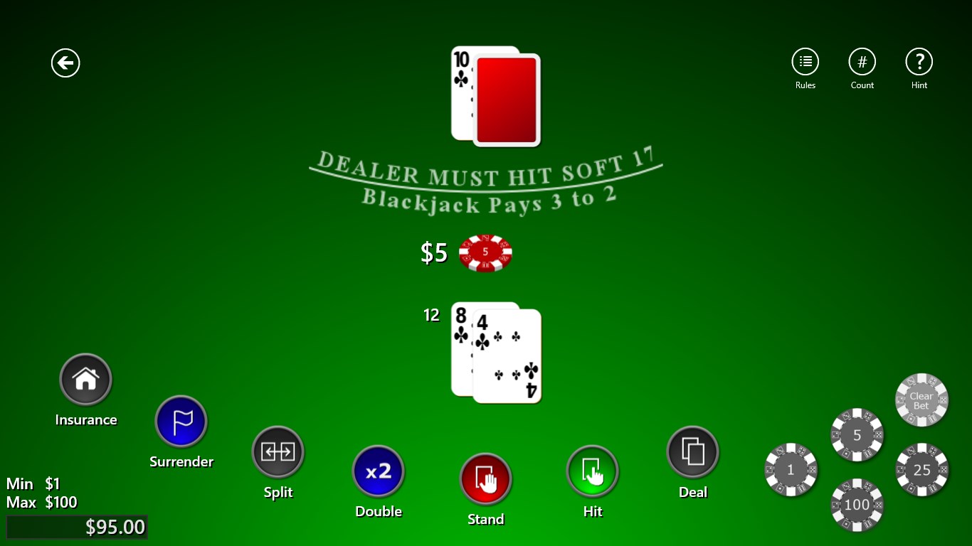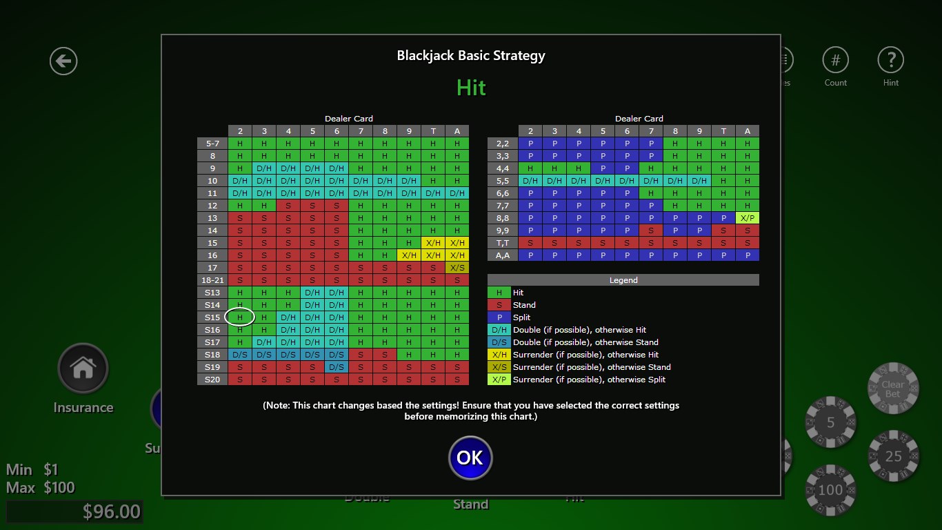 Interested in learning basic strategy? No problem. Click on "Hint" to view an accurate strategy chart at any time, with the correct move highlighted.