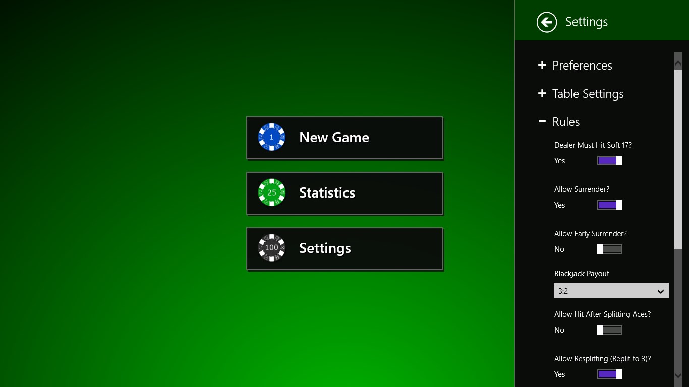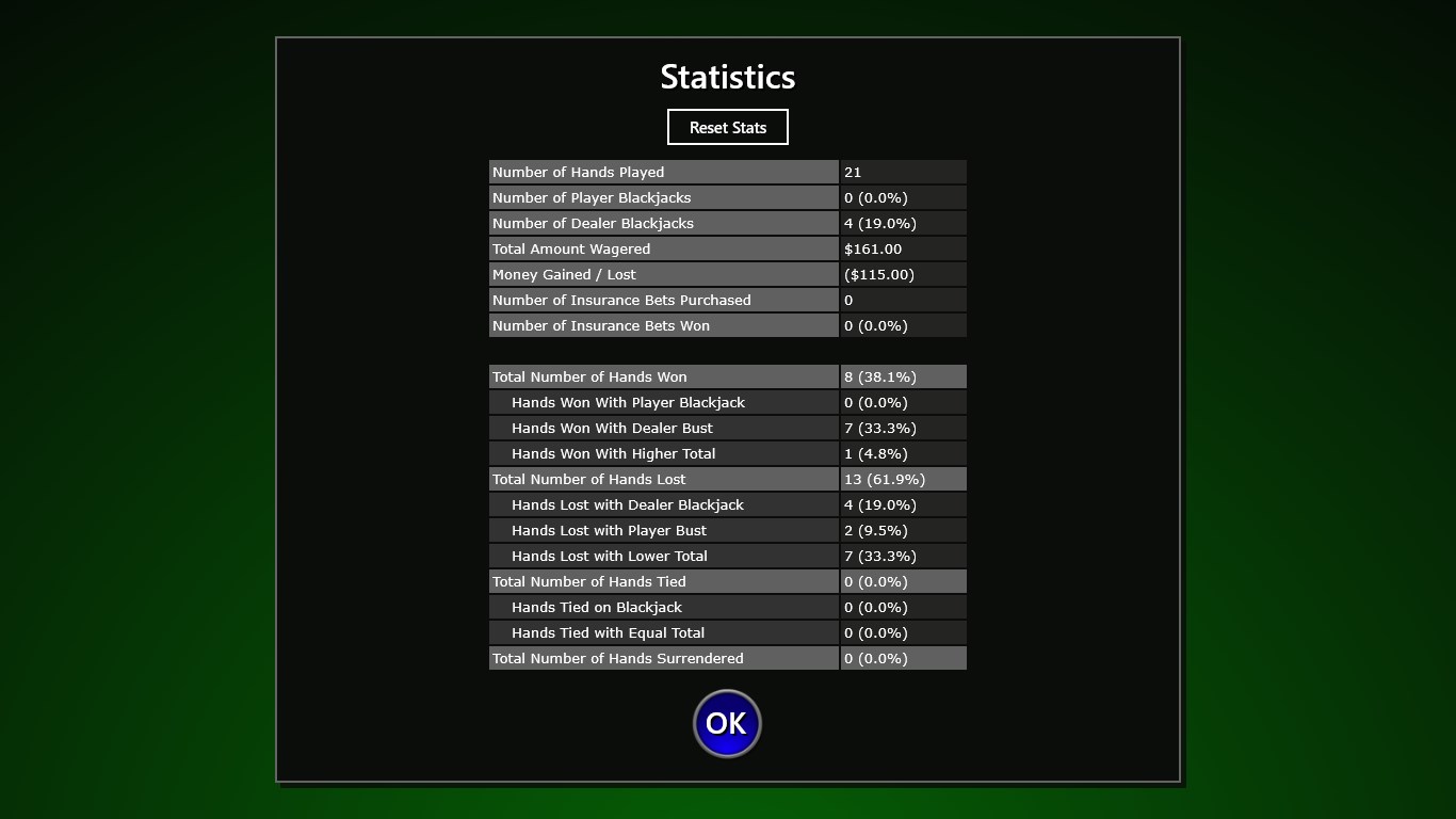 Accurately implemented rules that can be customizedFast paced game play with tasteful animationsBlackjack strategy charts at your fingertips to learn basic strategyChip balance saved between sessionsStatistics to allow you to track your strategy