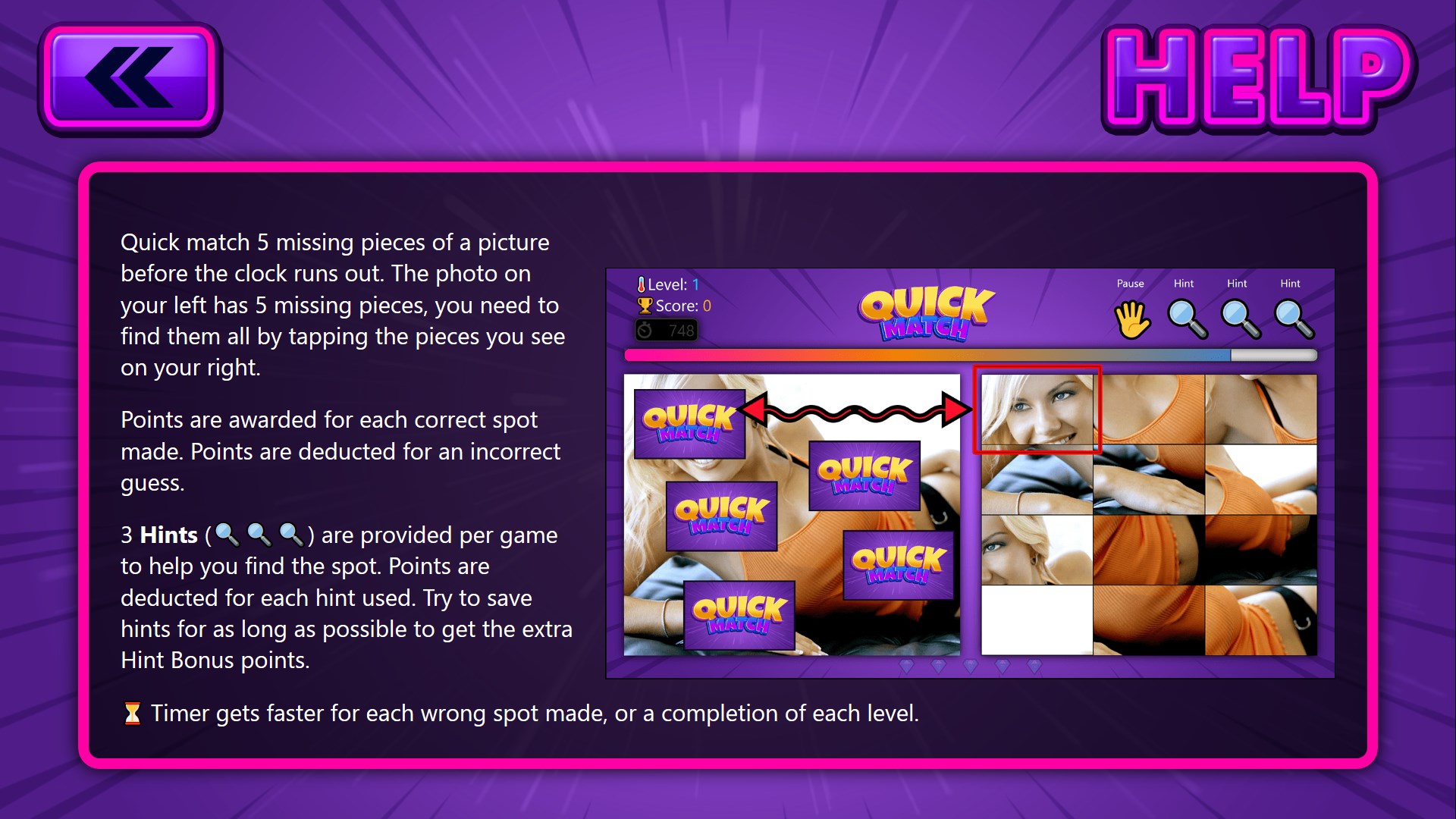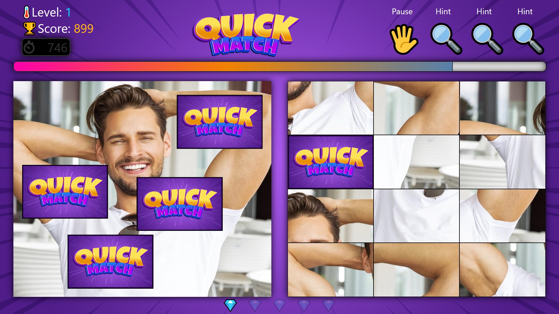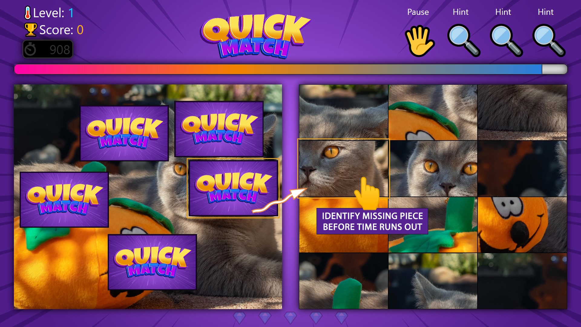 Quick Match challenges you to find 5 missing pieces in a picture before time runs out. The image on the left has 5 gaps, and your task is to locate them by tapping the corresponding pieces on the right. Get ready for a fresh and thrilling puzzle adventure!