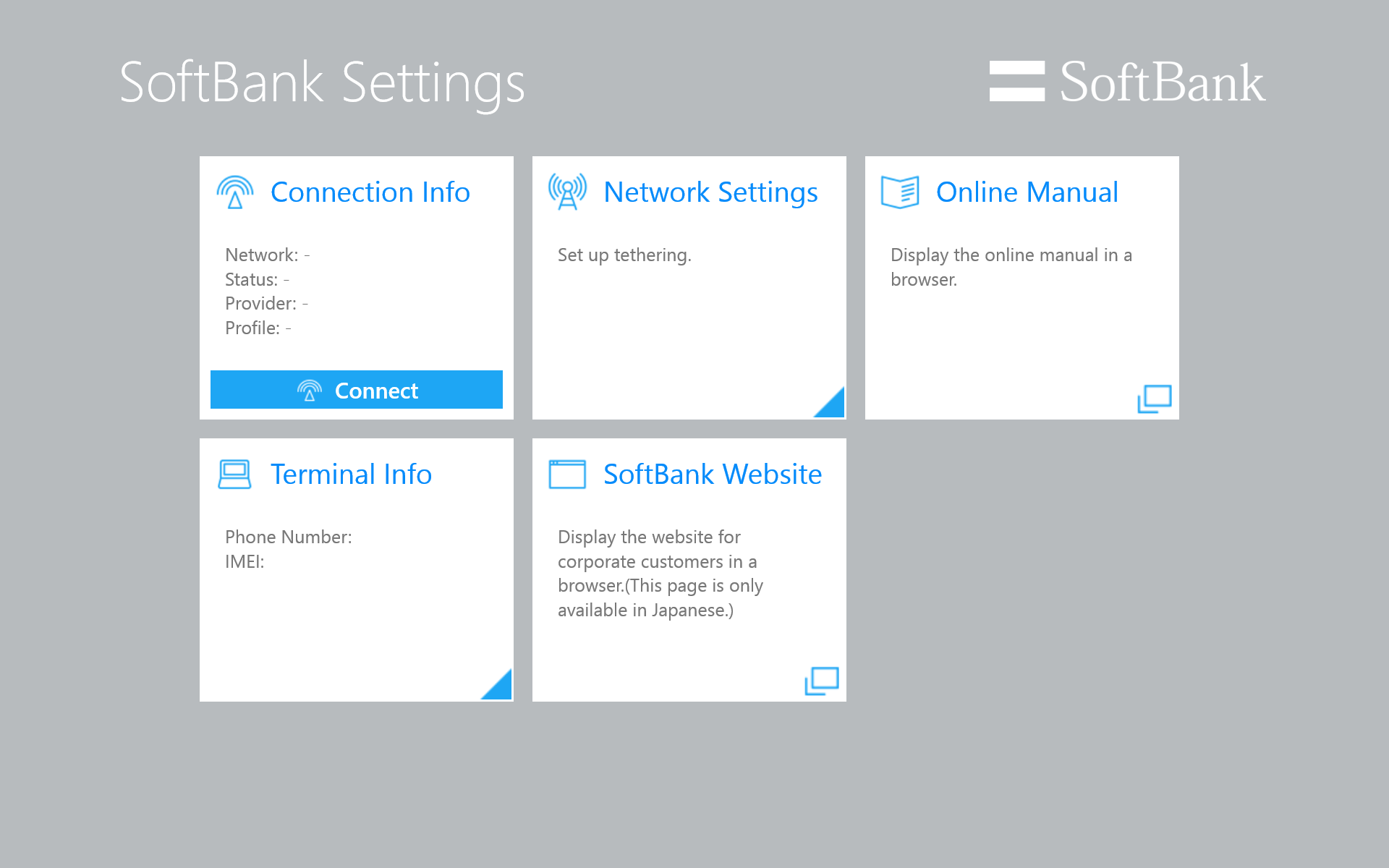 "Softbank Settings" is a mobile connection utility software for Windows® Tablet provided by SoftBank.