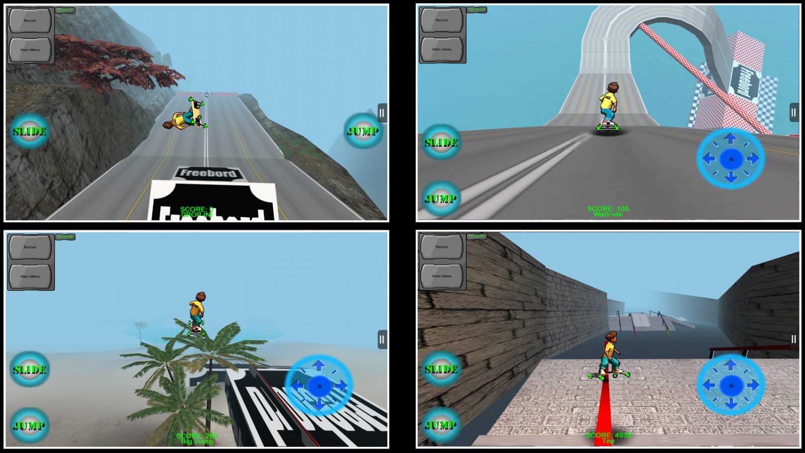 “Freebord The Game” is the first 3D game featuring the new sport Freebording. Freebord is a unique downhill board with 6 wheels, which feels much more like snowboarding than any other skateboard. Snowboard The Streets! You neither need a lift card nor snow, just the steep street in front of your house!