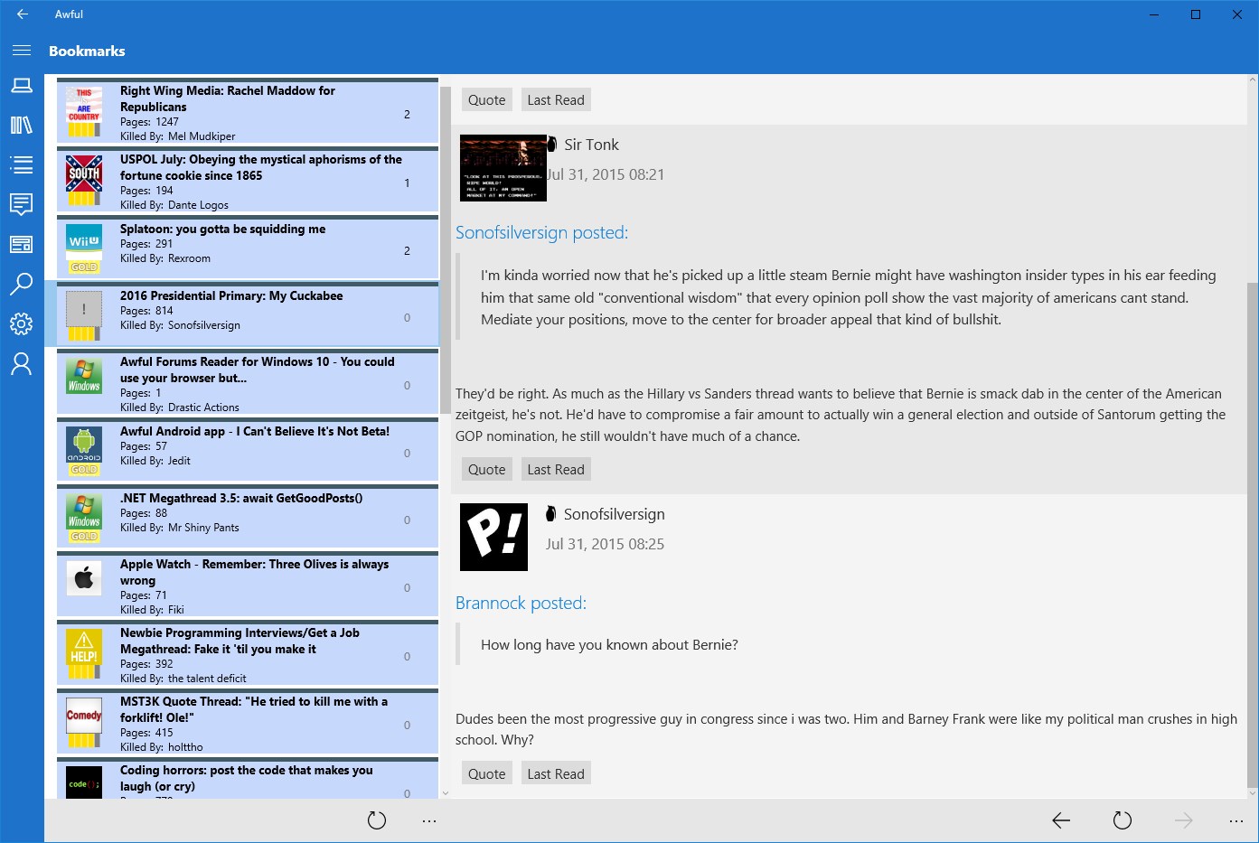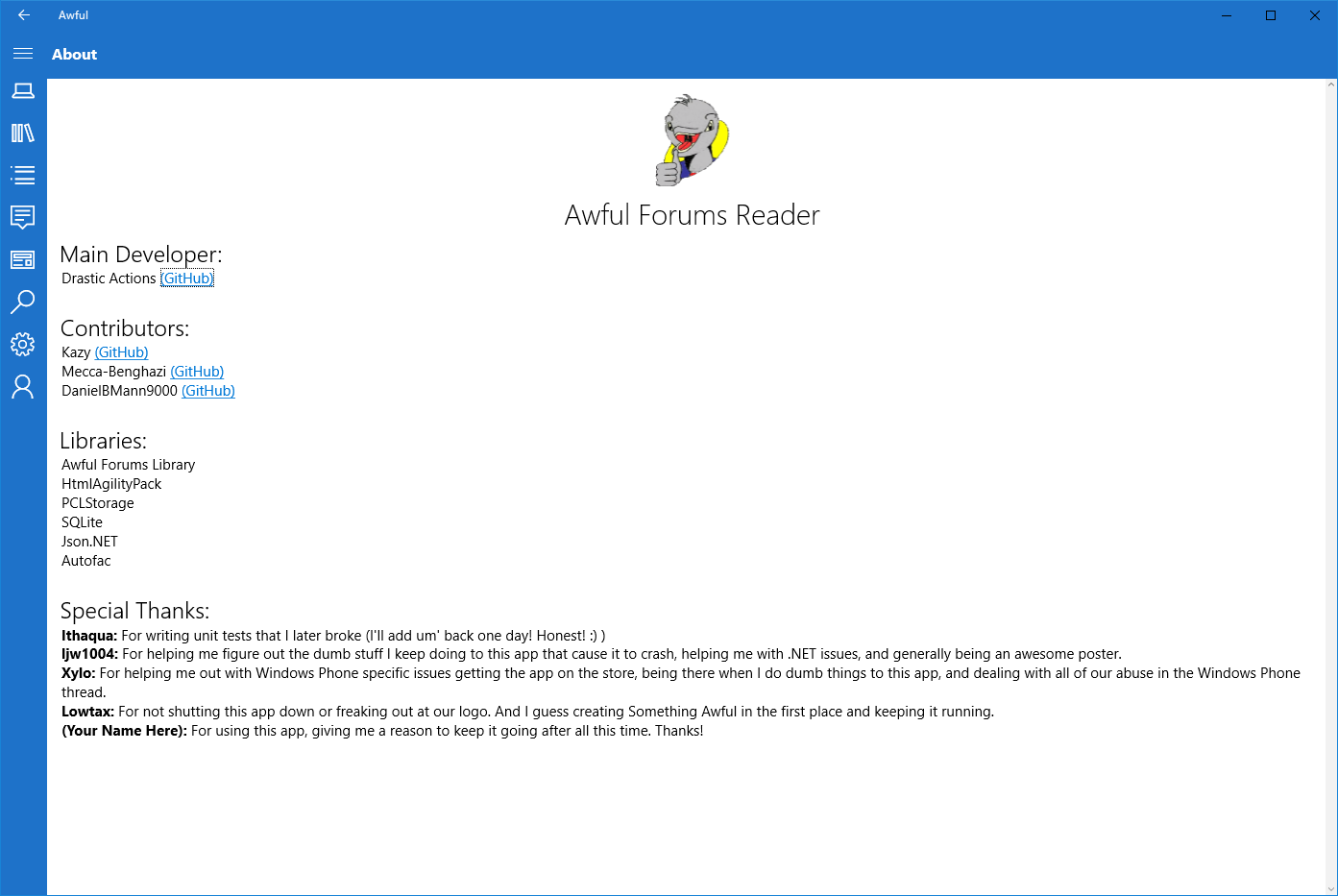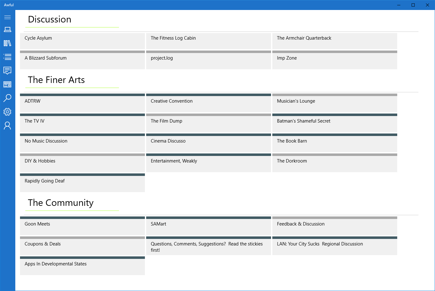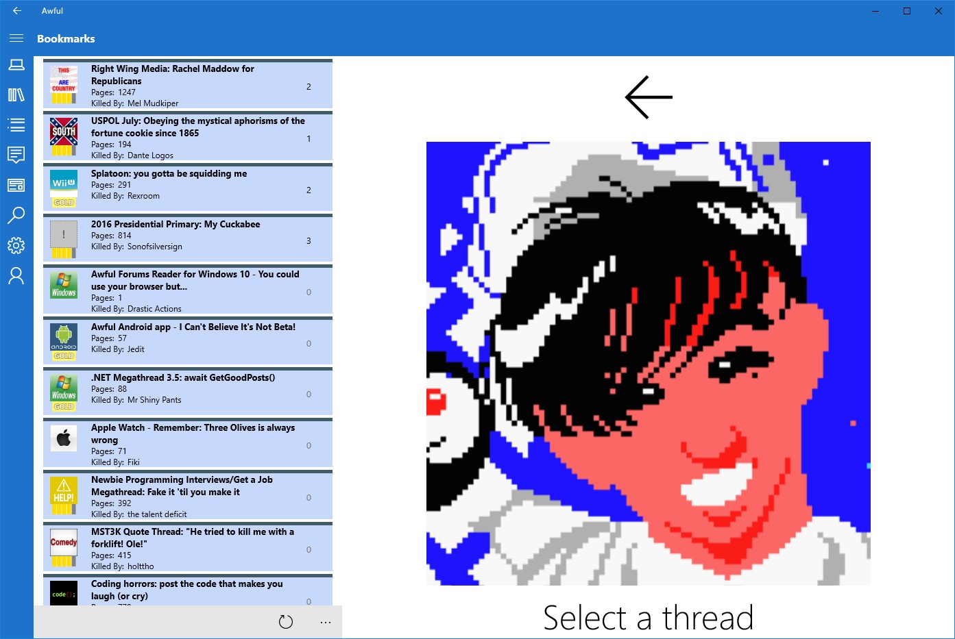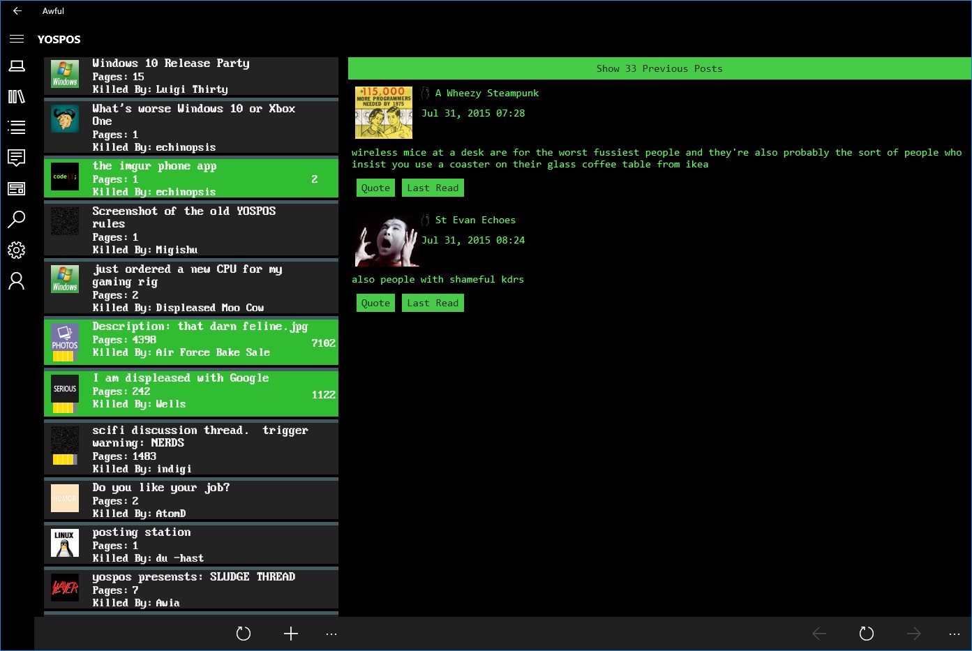 The Awful Forums Reader is a Windows forums reader for Something Awful. Now there is finally a good way to experience the forums on a tablet. Get notified of when threads your interested in are updated! Make good looking posts and replies! The Awful Forum Reader can do it all! But very specifically, it can view the Something Awful forums!