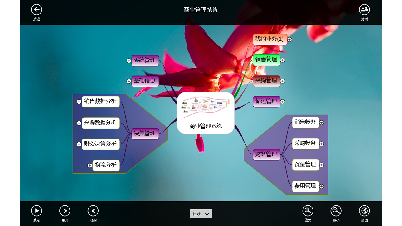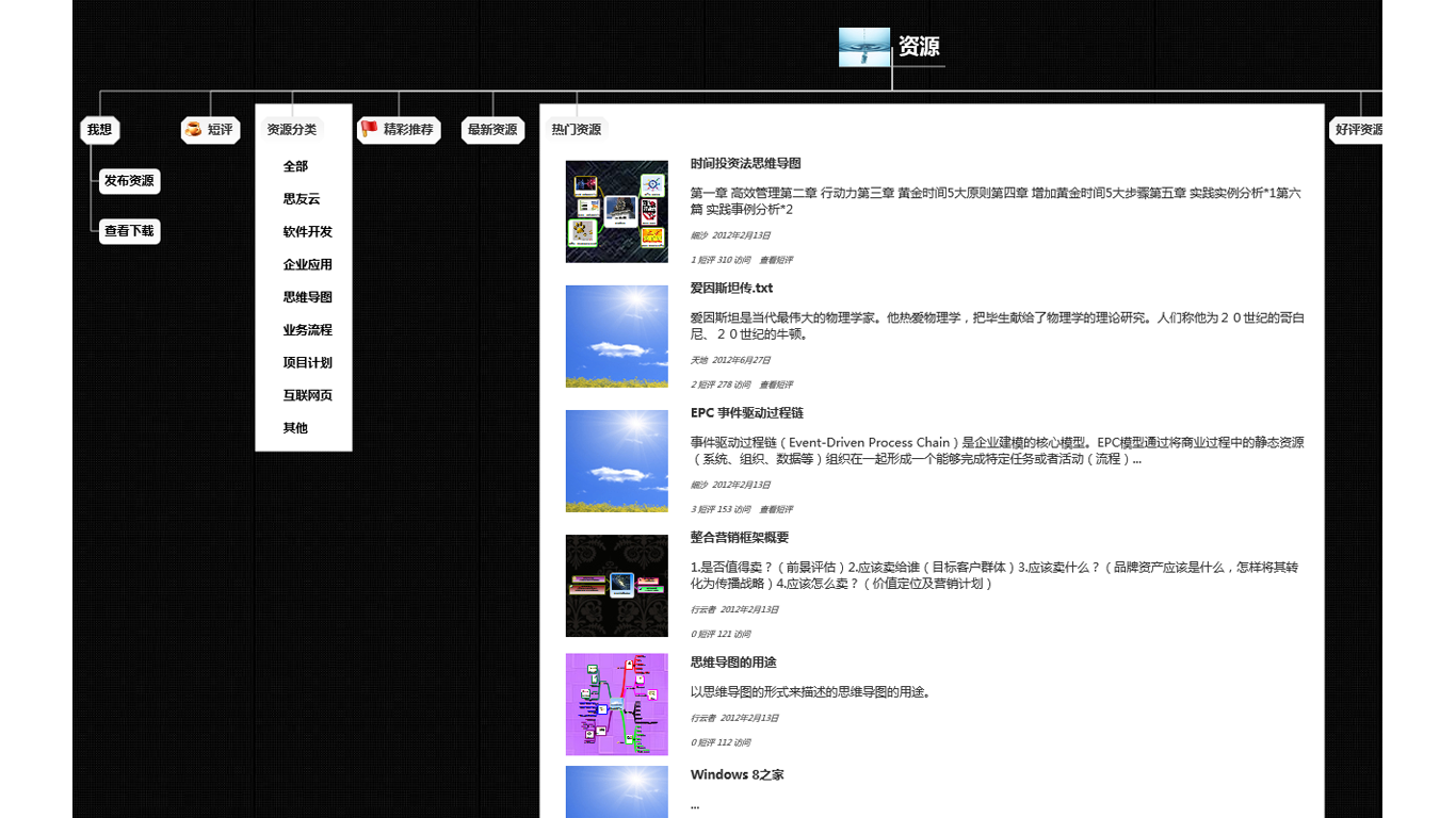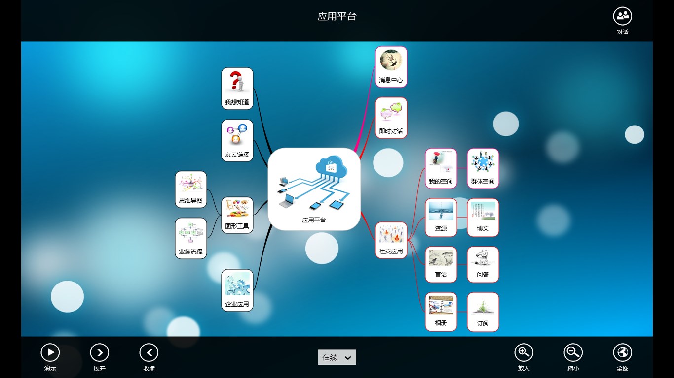 创造性地以思维导图作为应用界面,符合人们的思维习惯,带来前所未有的用户体验模型驱动的应用开发,将编码过程从人月计缩减为分秒计,给应用开发带来根本变革图库共享,图形化办公用户可共享图形协作的海量图库模板开放,社交应用开发者可获取社交应用的导图模板源码开放,企业应用开发者可获取企业应用的设计源码
