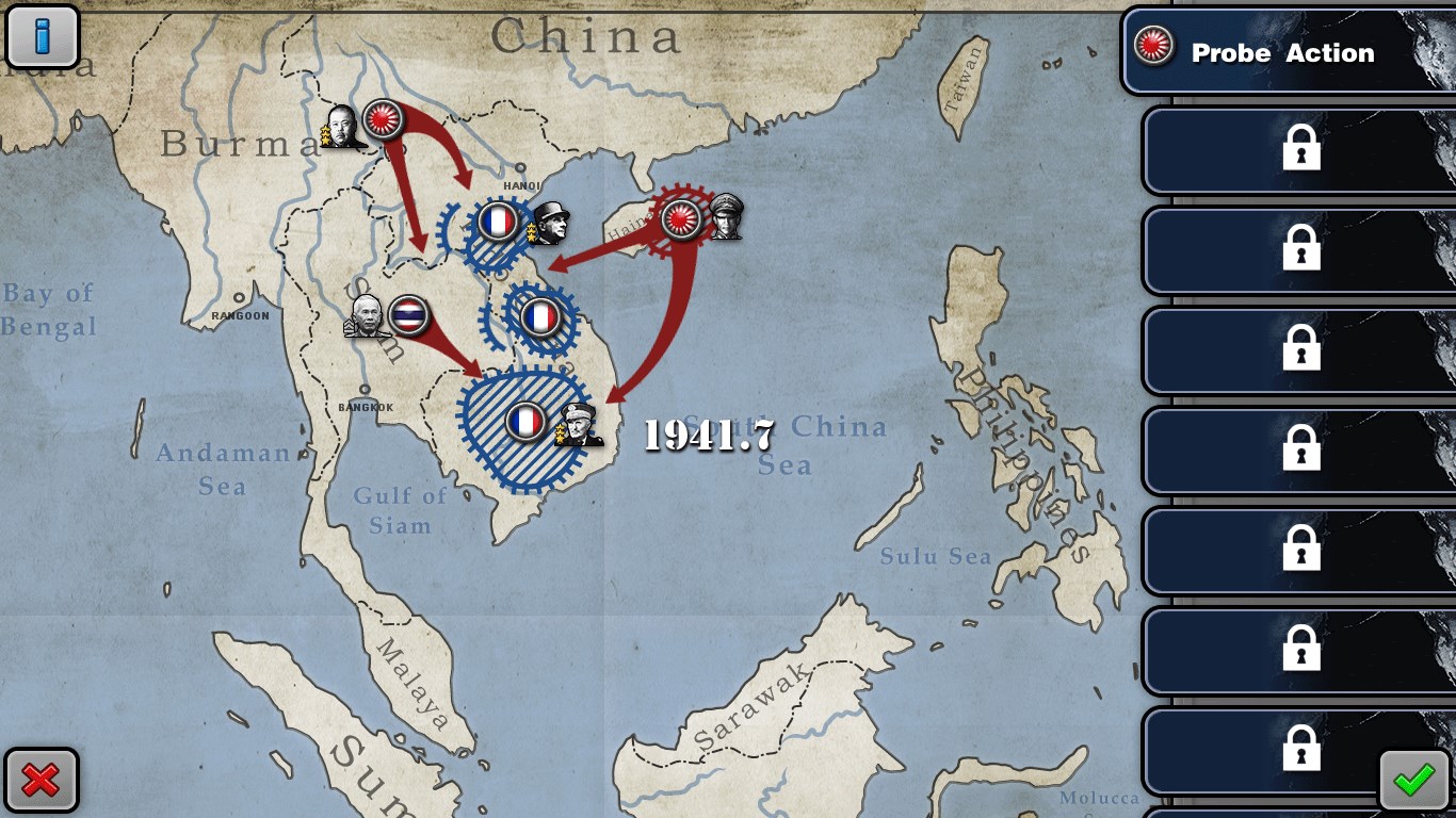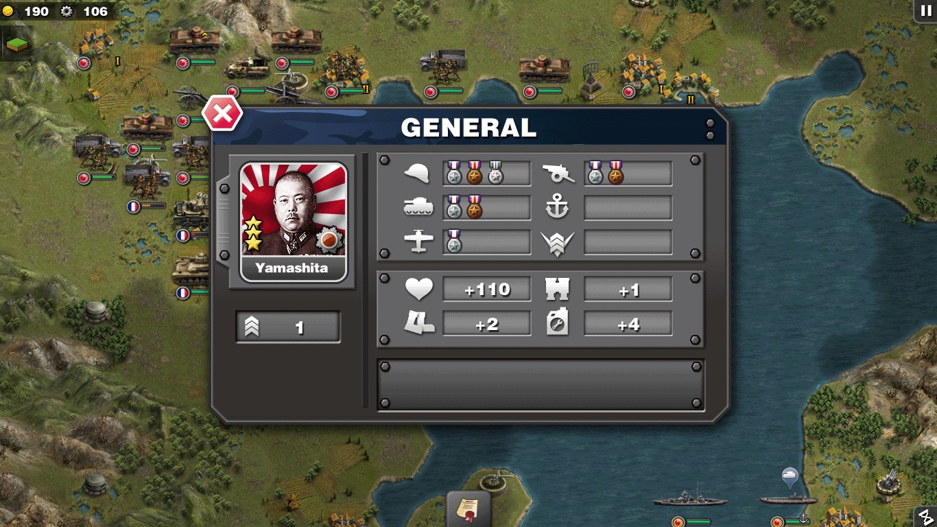 35 Legion Mode campaigns105 world class generals participated146 military units available37 countries involved in the war36 tactical instructions16 military ranks, 4 general assistants.Over 300 real terrains.Upgrade 6 military facilities in the headquartersMap Zoom In/OutAuto save function